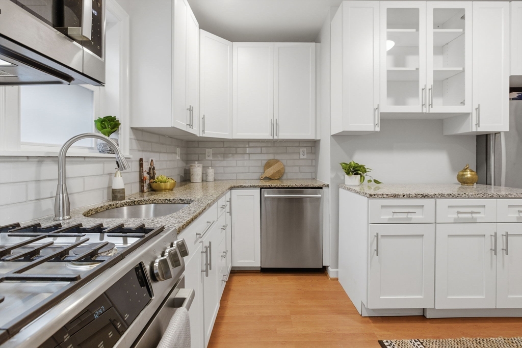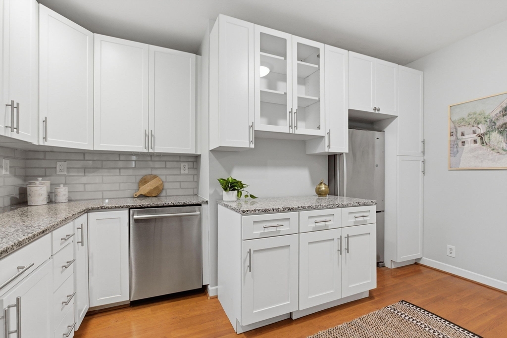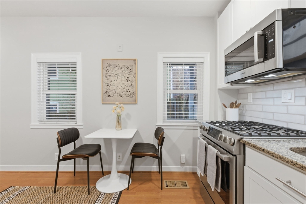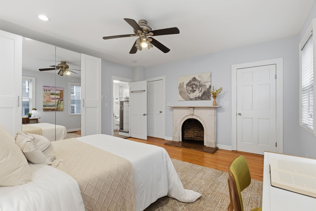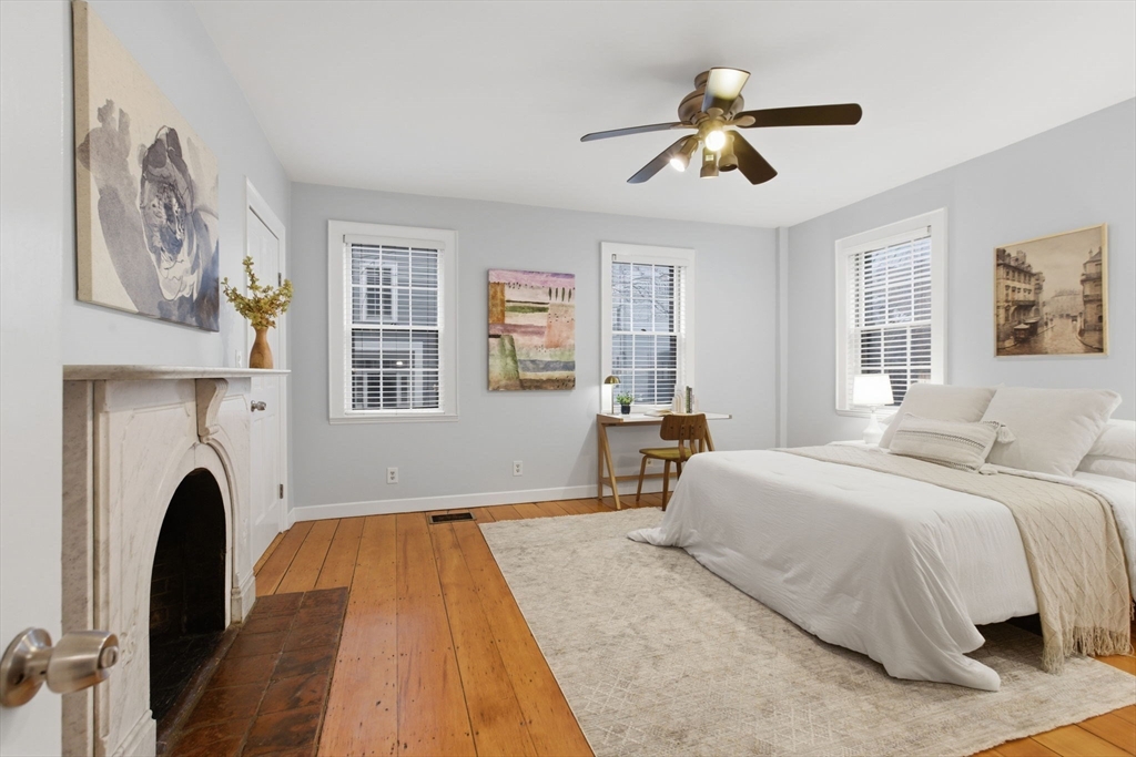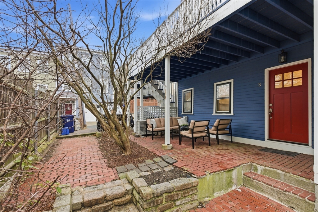 Rarely available one bedroom condo on historic High Street, steps from Monument Square. This spacious one bed one bath home provides 754 square feet of living space including an updated, eat-in kitchen with granite counters, stainless steel Bosche appliances, and subway tile backsplash. The kitchen offers direct access to a private, partially enclosed brick patio and garden area, creating a seamless indoor-outdoor living experience. The generously sized living room features a gas fireplace, perfect to unwind with a book or a glass of wine, and also boasts original wide pine floors, recessed lights, and ample natural light. The bedroom is large enough to have a king size bed and dedicated office area and also features an additional fireplace and ample closet space. The condo also offers its own private entrance, LOW HOA fees at $97/month, additional basement storage, central air, and in-unit Bosche washer/dryer. An exceptional value at $882/sf and an opportunity you won't want to miss!