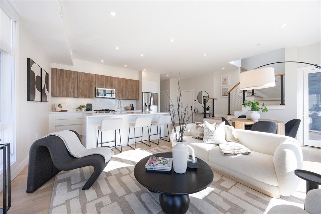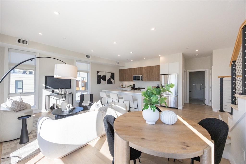 Welcome to 1 Loring Street, a sophisticated bi-level 3-bedroom, 3-bath condominium offering 1,529 square feet of meticulously designed living space in one of Somerville’s most vibrant corridors. This sun-drenched, south-facing residence features soaring 10.5-foot ceilings, floor-to-ceiling windows, and three exposures that create an airy, light-filled atmosphere throughout. High-end finishes and modern detailing elevate the interior, while the open-concept layout seamlessly balances style, comfort, and functionality. The main level opens to a private balcony, perfect for morning coffee or evening relaxation, while the expansive private roof deck provides an ideal setting for entertaining, gardening, or enjoying city views. Additional highlights include washer and dryer in-unit, generous bedroom sizes, and thoughtful storage throughout. Ideally located near Union Square, residents enjoy immediate access to acclaimed restaurants, cafes, shops, arts venues, and the Green Line Extension