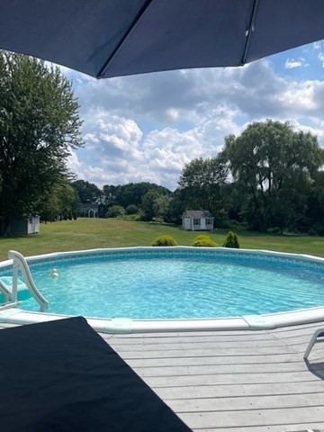Nearly an acre of beautifully landscaped grounds sets the stage for this warm and inviting home. Inside, the eat-in kitchen features granite countertops, stainless steel appliances, custom shaker-style cabinetry, and ample room for casual dining. A sliding glass door leads directly to the back deck / yard, complemented by a convenient half bath and side entrance for everyday ease. The family room exudes character with its farmhouse-style wood-burning fireplace, creating a cozy spot to gather. Formal living and dining room flow seamlessly to one another, filled with natural light provided by the bay window making entertaining or special occasions a breeze. Upstairs, three generously sized bedrooms and full bathroom provide comfortable accommodations. Additionally, the primary suite offers a private full bathroom and ample closet space. Outside, the sprawling backyard is designed for pure enjoyment, highlighted by a sparkling above-ground pool and spacious two-tier deck.