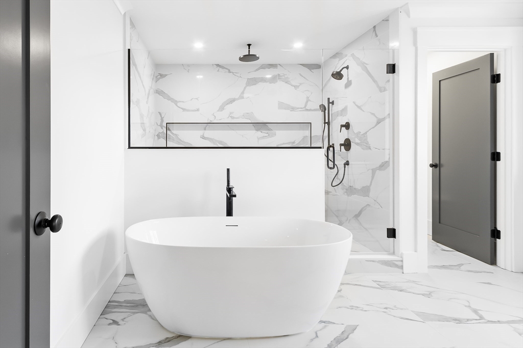 NEW CONSTRUCTION - MARCH DELIVERY! Looking for that village lifestyle with high walk score? Don't miss this luxury Farmhouse ideally located just a 1/2 mile to Natick Center cultural district. Impeccably designed open floor plan with 9' ceilings, huge center island kitchen with tons of windows and light throughout this gorgeous home. Other features include a cathedral dining room, coffered ceiling family room; first floor guest suite / office with french doors; mud room with custom built-in, stunning primary suite with custom walk-in closet and oversized tile shower. Large, finished daylight basement. Beautiful lot with large exclusive use area making this as close to single family living as it gets! Farmer's porch with metal roofing. Daylight basement is finished with playroom, media room and full bath. Ideal central location in Natick close to great schools, world class shopping, commuter rail & all major routes.