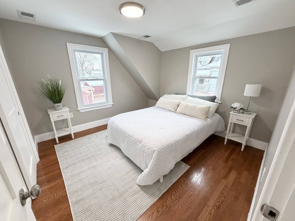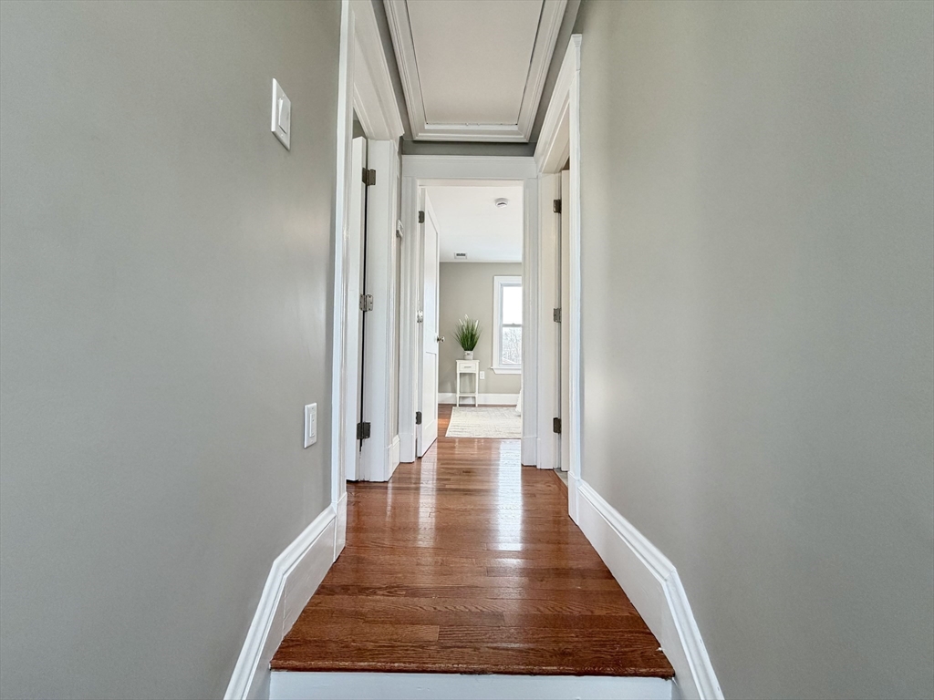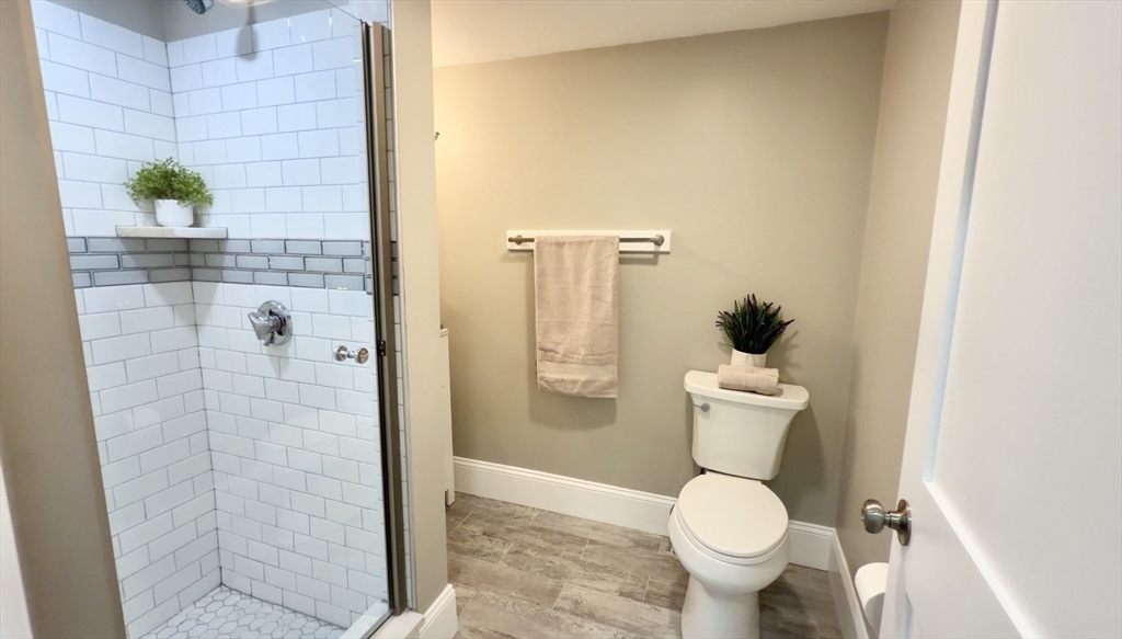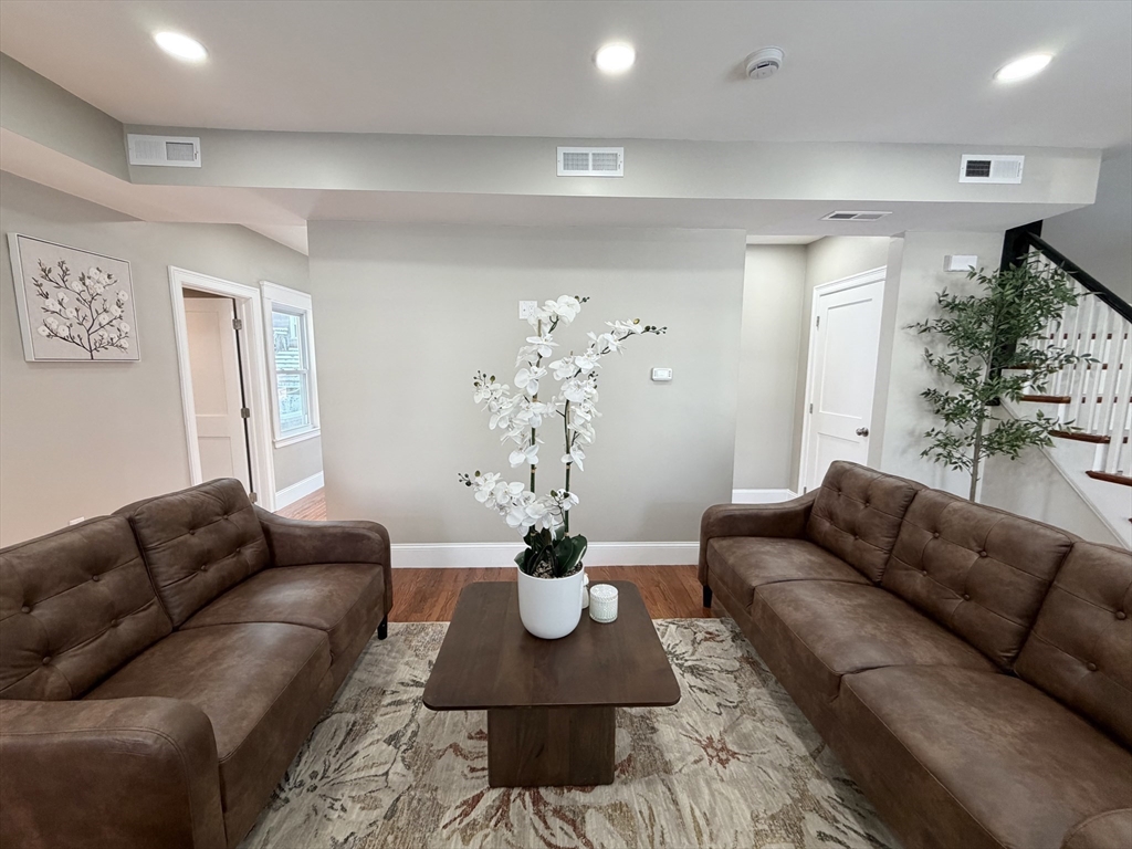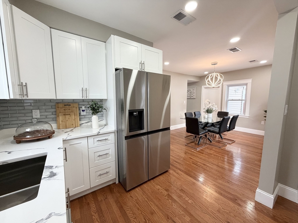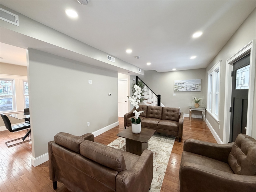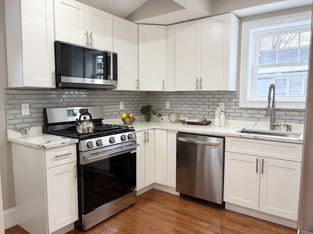Fully renovated down to the studs, this stunning three-bedroom, two-bath home effortlessly blends modern style with everyday functionality. The first floor layout opens up to a sunlit living room with high ceilings, hardwood flooring throughout, seamlessly flowing into a formal dining area, and a beautifully crafted kitchen with new stainless steel appliances, quartz countertops, & sleek subway tiled backsplash. A first-floor one bedroom & full bathroom provide ideal accommodations for guests or flexible living. Upstairs, the primary suite features two closets, followed by a third bedroom, & second full bathroom. This property also features a large 5+ car newly paved driveway, front porch, and wrap around yard - great for summer entertaining. This home is Energy Efficient with spray foam insulation, tankless water heater, new HVAC, & EV charger connection! New roof, electric, plumbing, siding, and basement with full door exterior access & laundry hookups.