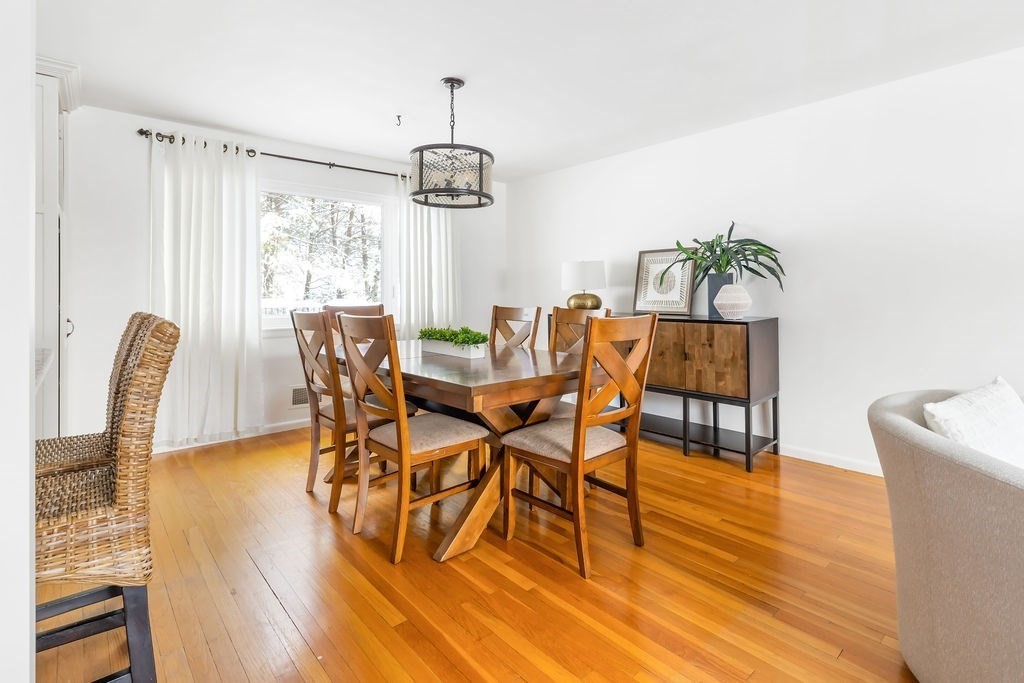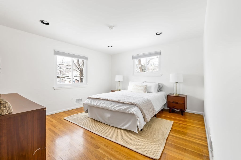 This breathtaking home offers an open flow and flexible floor plan filled with natural light across two levels. The luxurious designer kitchen features custom details, granite countertops, stainless steel appliances, gas cooking, and a breakfast bar that opens to the dining room and expansive living room with a picture window and marble fireplace—perfect for entertaining. Upstairs are three spacious bedrooms, 1.5 updated baths, and gleaming hardwoods. The lower level includes a fourth bedroom with a built-in Murphy bed and a full bathroom, plus a bright office, a cozy den, and a formal foyer. Outside, enjoy a Trex deck (2022), beautiful stonework, professional landscaping, and mature trees and plantings. Major updates include a gas fireplace and windows in 2019, and a roof, A/C, heating system, hot water heater, kitchen, landscaping, exterior, lighting, brick walkway, and shutters all in 2016. Picturesque neighborhood close to major roads and shopping.