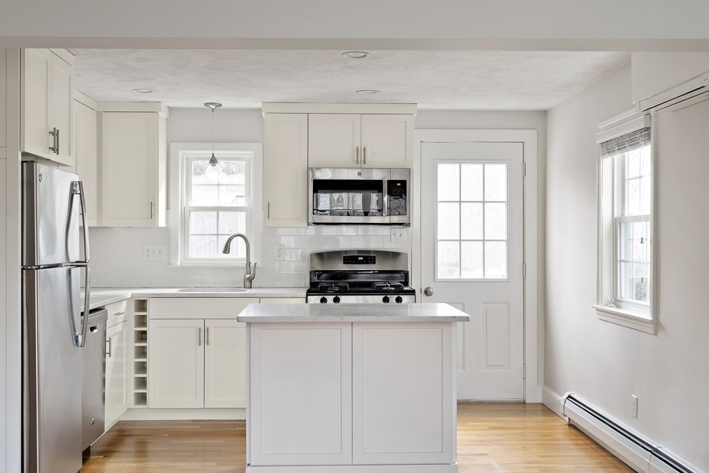 This beautifully renovated townhouse delivers a refined balance of modern style and effortless living. The kitchen is thoughtfully designed with a quartz-topped island, classic shaker cabinetry, stainless steel appliances, recessed lighting, and a timeless subway tile backsplash, opening seamlessly to a bright living and dining area ideal for everyday living and entertaining. A chic powder room with designer tile completes the main level. Hardwood floors run throughout the home, leading upstairs to a spacious primary bedroom, linen closet, and a spa-inspired bath featuring quartz counters, tiled floors, and a subway tile tub and shower. Recent upgrades include a gas Rinnai furnace and water heater, updated electrical, and new thermal windows. The full walk-out lower level offers laundry hookups and generous storage. Outdoors, a private stone patio with fresh landscaping creates an inviting space for outdoor dining and relaxation. Ideally located near public transportation and parks!