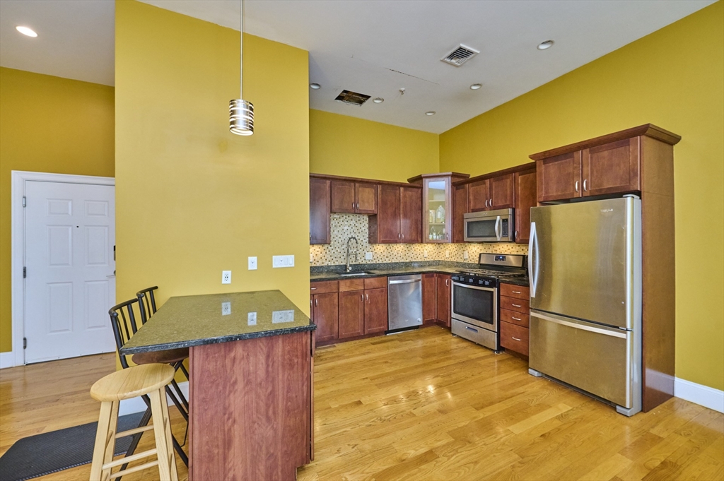 Experience effortless urban living in this immaculate 2-bedroom, 2-bathroom residence at the highly sought-after Presidents Crossing. This 1,218-square-foot condo boasts a sophisticated open-concept layout defined by soaring high ceilings, gleaming hardwood floors, and oversized windows that flood the space with natural light. The chef-inspired kitchen features premium granite countertops, cherry cabinetry, and stainless steel appliances, flowing seamlessly into an expansive living area—perfect for entertaining. Retreat to the spacious primary suite, complete with a large walk-in closet and a private, modern en-suite bath. Additional highlights include in-unit laundry, central air, and the rare convenience of two deeded parking spaces (one heated garage space and one exterior spot). Located in the heart of Quincy, you are just minutes from the vibrant dining of Quincy Center, the MBTA Red Line, and major highway access to Boston. Buyer to verify all information.