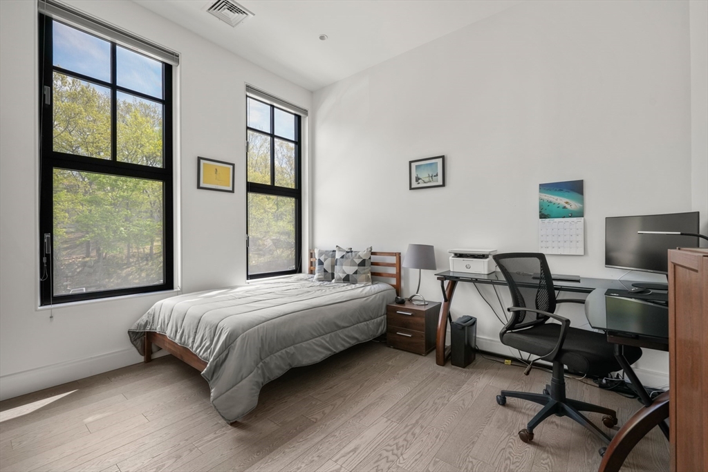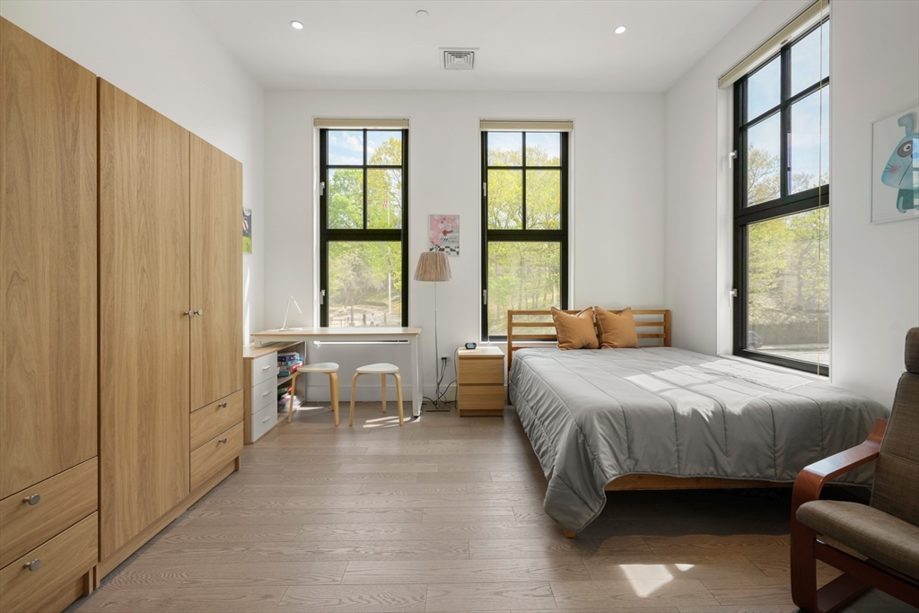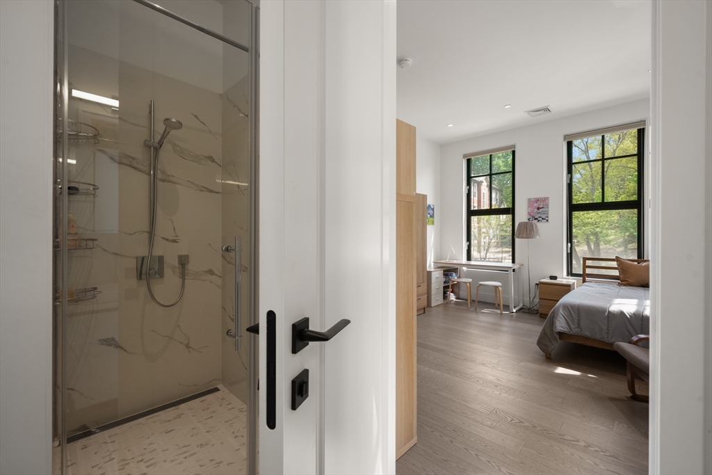 Experience effortless city living in this luxurious 2-bed, 2-bath home at The Leverett, complete with two garage parking spaces. Built in 2022, this boutique 5-unit building offers elevator access, a common terrace, and a lifestyle designed for convenience. The gourmet kitchen features custom cabinetry, Bosch appliances, induction cooking, and waterfall quartz counters with a spacious breakfast bar. Oversized windows fill the open living area with natural light. The primary suite includes a walk-in closet and spa-style bath with a floating double vanity and large tiled shower. Enjoy central HVAC, hardwood floors, and in-unit laundry. Ideally located in Brookline near top-rated restaurants, shops, and effortless commuting to Longwood, Chestnut Hill, and downtown Boston—perfect for anyone seeking a turnkey transition.