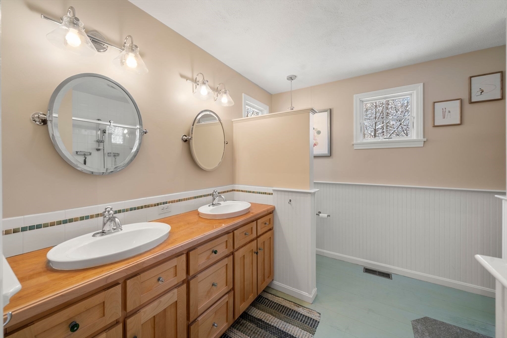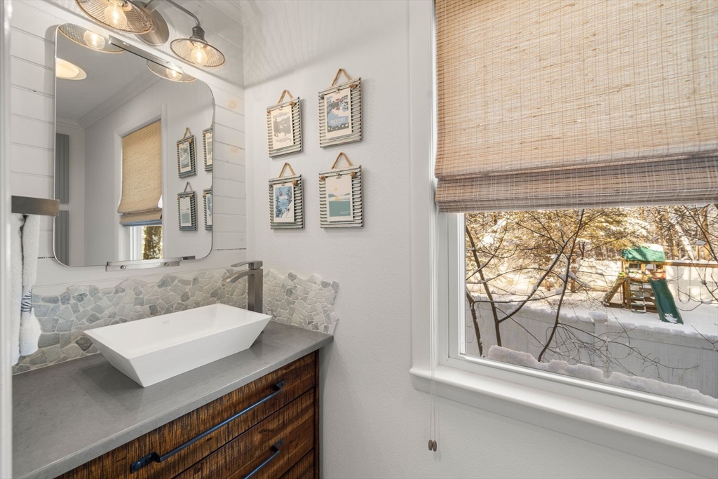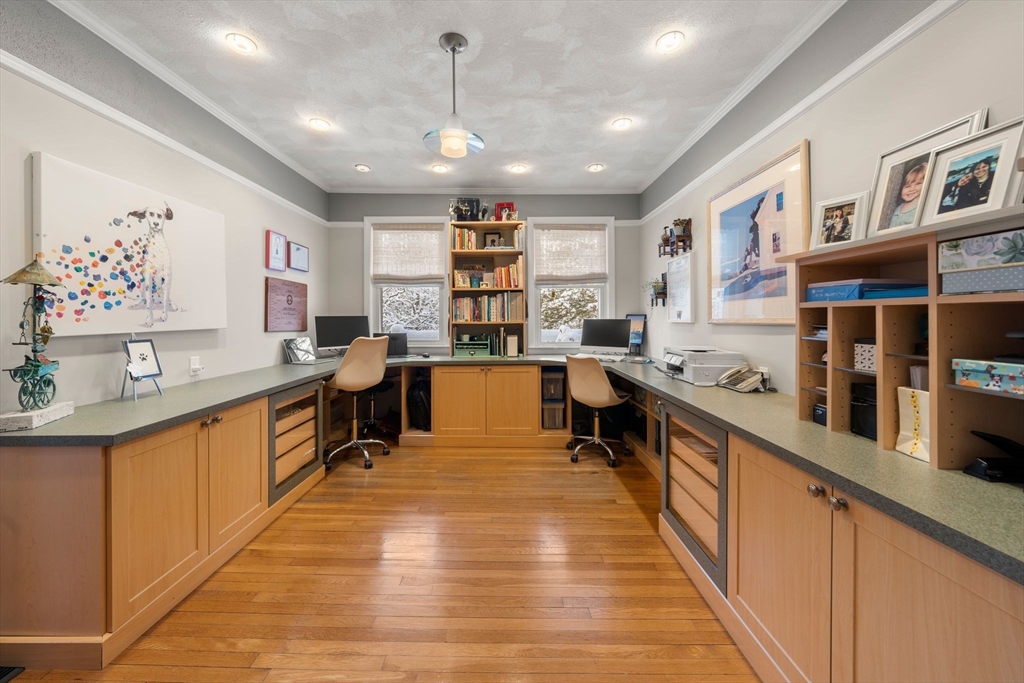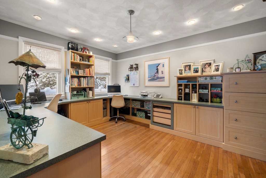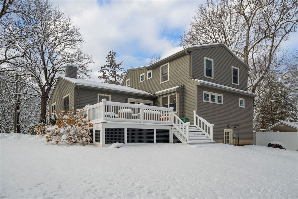 Sparkling and immaculate, this storybook contemporary Cape is bathed in natural light and has been lovingly renovated and impeccably maintained. The elegant yet functional layout offers 5 bedrooms and 2.5 baths, including a coveted first-floor primary suite with a private ensuite bath. An open-concept floor plan showcases soaring ceilings, rich hardwood floors, and a gas fireplace that creates a warm focal point for refined living and entertaining. A spacious office provides exceptional work-from-home flexibility. Step outside to a beautiful deck overlooking mature perennial plantings that deliver vibrant seasonal color and a serene outdoor retreat. A one-car detached garage adds both convenience and practicality. Timeless charm meets modern sophistication in this truly move-in-ready gem!