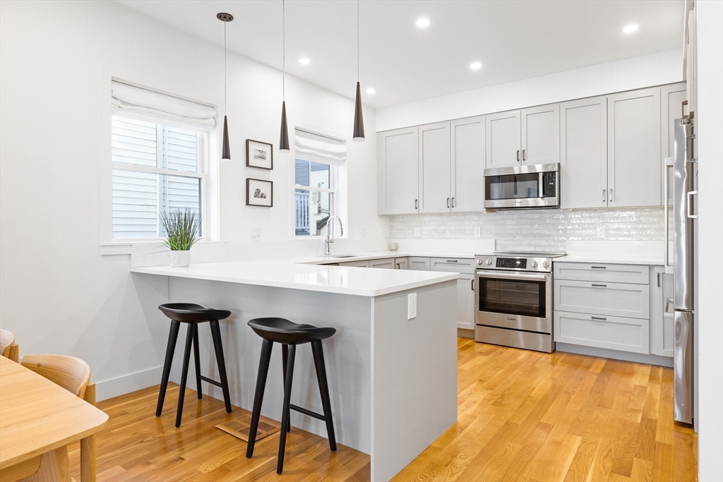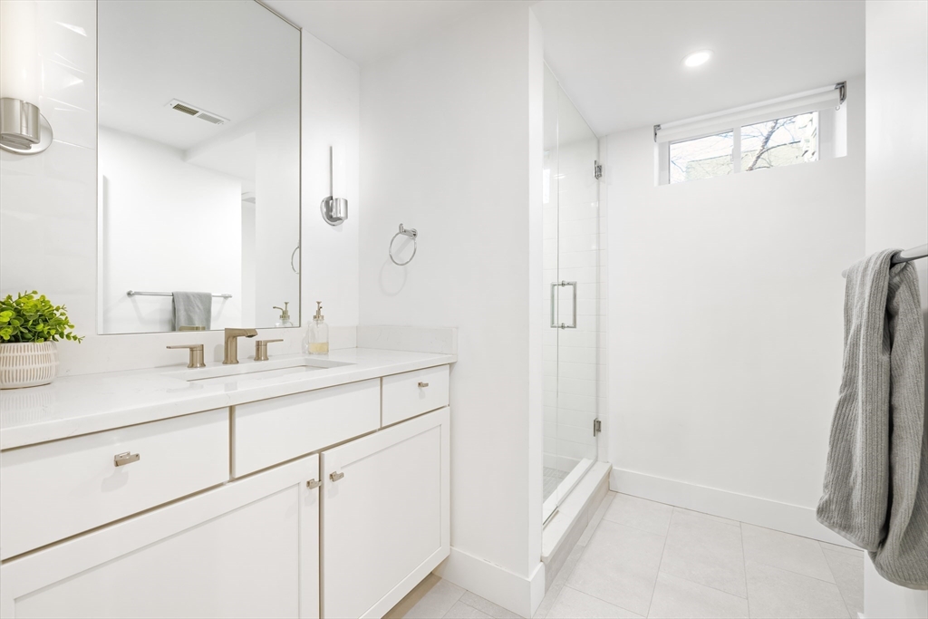 Elegant 3+ bedroom, 3.5 bathroom like new townhome set on tree lined street in quiet East Cambridge neighborhood. Fully renovated in 2024, tucked back from the street, this home offers gorgeous architecture spread over 3 finished levels with 9 ft ceilings, tons of natural light, and pristine wood floors. Stunning kitchen with plentiful cabinets, stainless steel appliances, quartz counters and counter seating, opens to dining area and spacious livingroom with oversized bow windows. Stairs lead to primary suite with walk-in closet, bath with double sinks, tiled shower; family bedroom; another full bathroom with tiled shower/tub combo; and office, which could serve as guestroom or nursery. Lower level with spacious familyroom, large bedroom with full window, full bathroom, laundry room, and storage. Like new with updated electric, plumbing, gas heat, central ac, new windows, flooring, appliances. Phenomenal location, short distance to Kendall Square, M.I.T., Lechmere Green Line, and more.