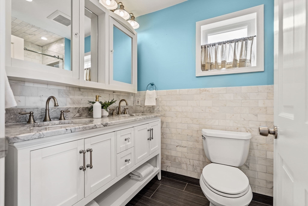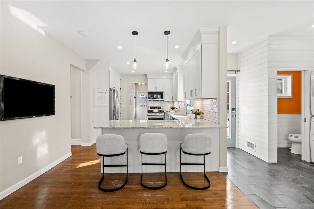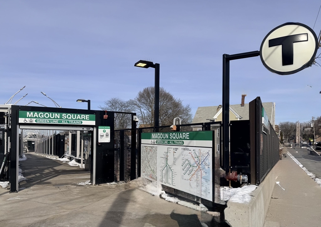 This completely renovated Colonial home offers 4 bedrooms and 2.5 bathrooms. The home features upgraded two-car parking, a newer kitchen which is open and equipped with modern appliances. The newer half bath, laundry area and mudroom come with radiant floor heating.The property is conveniently located just a five-minute walk from the Magoun Sq Train station, providing easy access to public transportation. An electric vehicle charger is available on-site for those with eco-friendly transportation needs. The interior of the home has been freshly painted, creating a clean and welcoming atmosphere.The roof and HVAC systems have been updated, ensuring the home is energy-efficient plus the owner has installed solar panels, harnessing renewable energy by reducing utility costs. A mudroom provides storage and organization, while the sprinkler system helps maintain the landscaping. The home also features a dining room with a custom built-in bar area catering to entertaining and hosting guests.