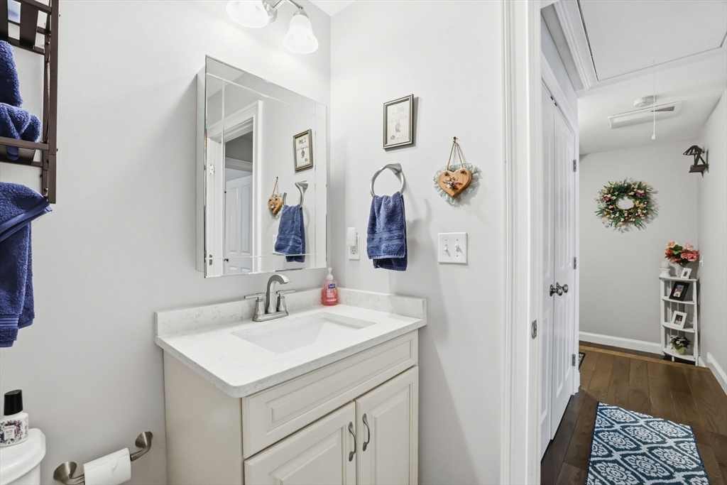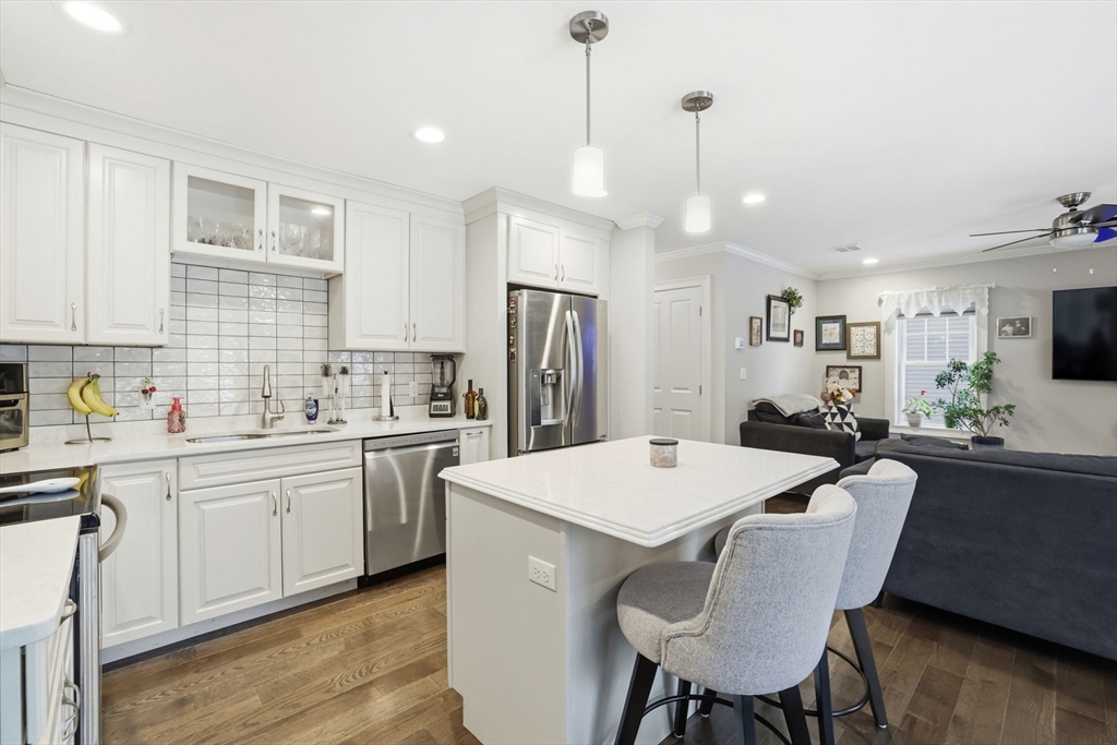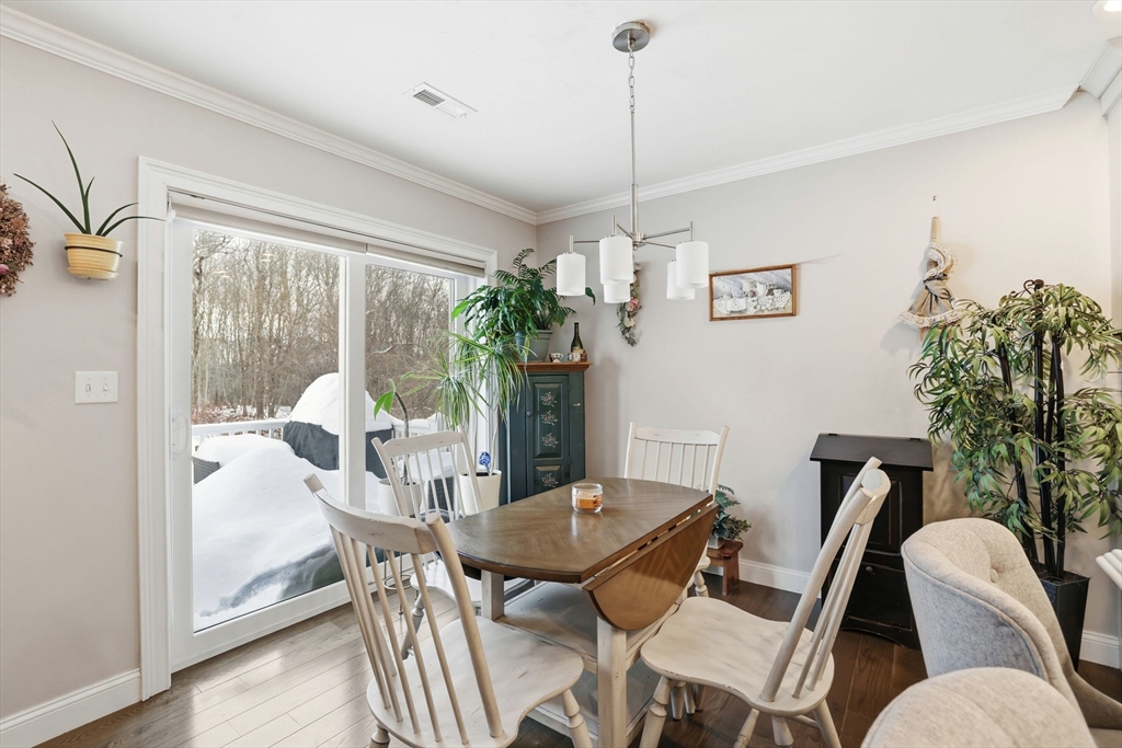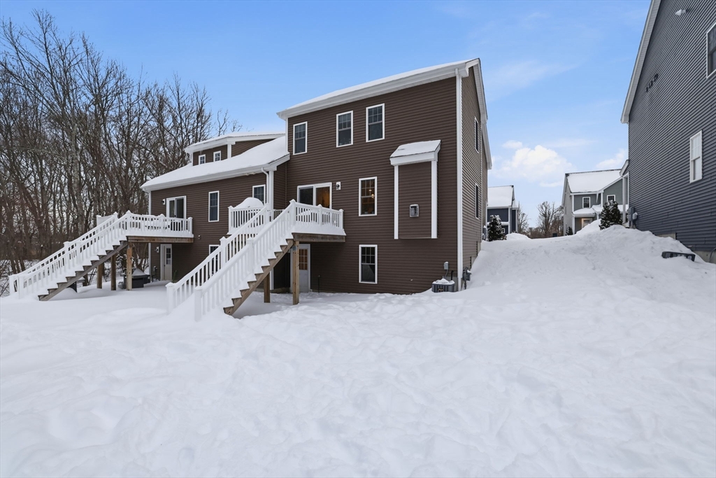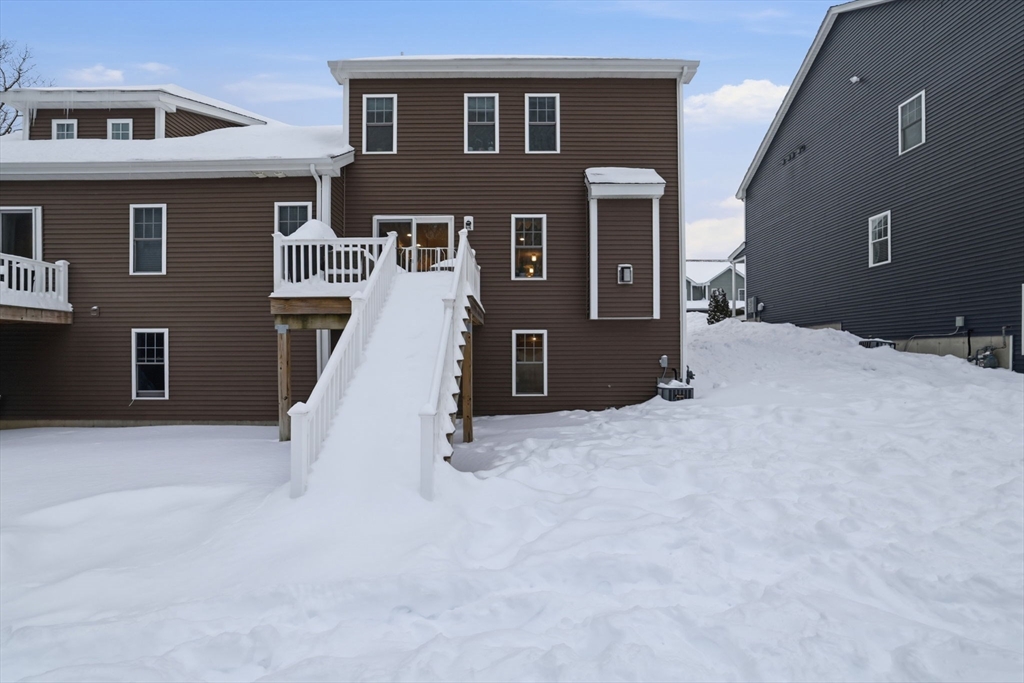 Move-in ready townhouse-style condo located on a quiet cul-de-sac corner setting, offering added privacy and close proximity to the woods. Hardwood floors throughout and central air provide comfort and ease. The kitchen features a new backsplash, and the living area is highlighted by a cozy gas fireplace. Walk-out basement with windows offers excellent storage and potential to finish. Enjoy outdoor living on the private deck.The second level includes three spacious bedrooms and two full baths, including a primary suite with a private bath and large walk-in closet. Attic storage available. The interior was fully painted approximately one year ago and is truly move-in ready. Recently updated garage features epoxy flooring, cabinetry, and added storage.