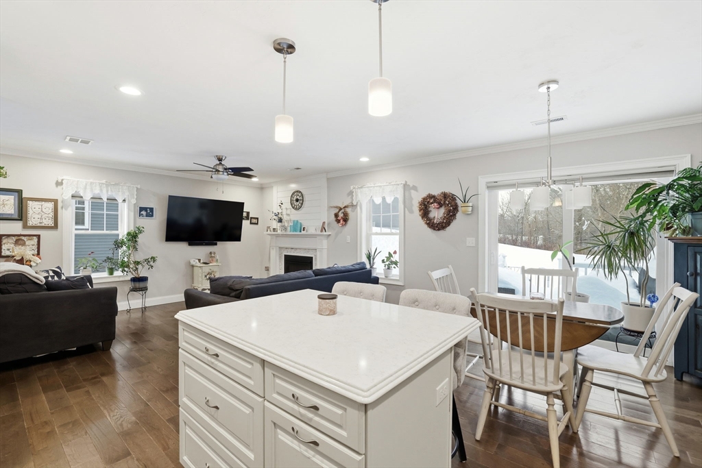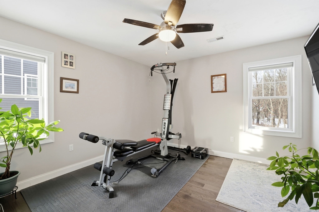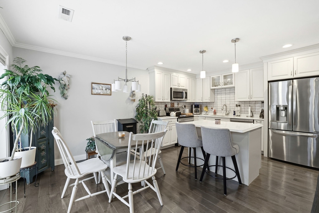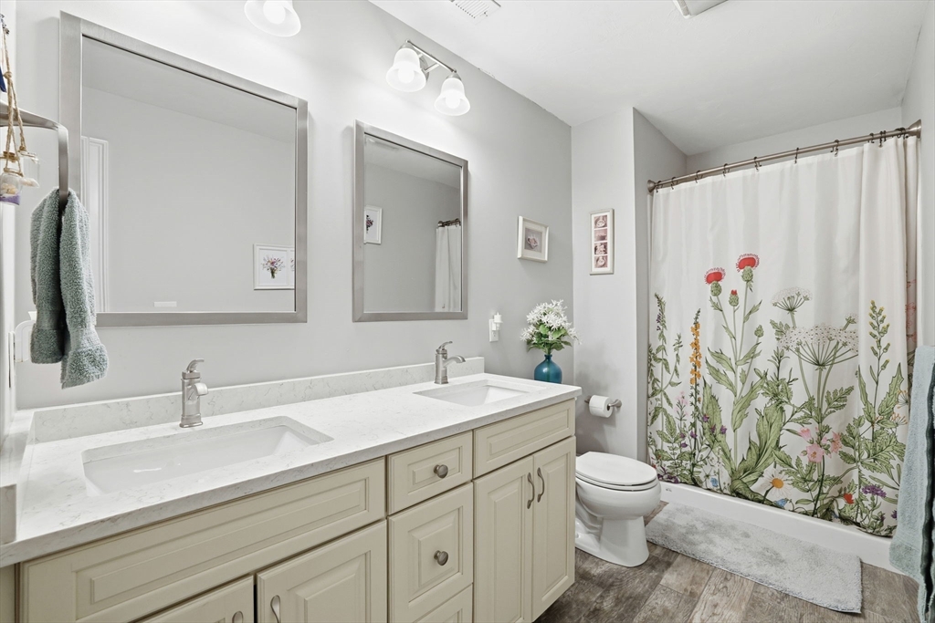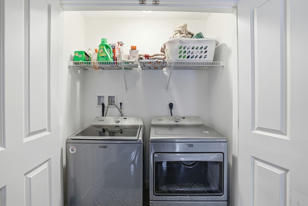 Move-in ready townhouse-style condo located on a quiet cul-de-sac corner setting, offering added privacy and close proximity to the woods. Hardwood floors throughout and central air provide comfort and ease. The kitchen features a new backsplash, and the living area is highlighted by a cozy gas fireplace. Walk-out basement with windows offers excellent storage and potential to finish. Enjoy outdoor living on the private deck.The second level includes three spacious bedrooms and two full baths, including a primary suite with a private bath and large walk-in closet. Attic storage available. The interior was fully painted approximately one year ago and is truly move-in ready. Recently updated garage features epoxy flooring, cabinetry, and added storage.