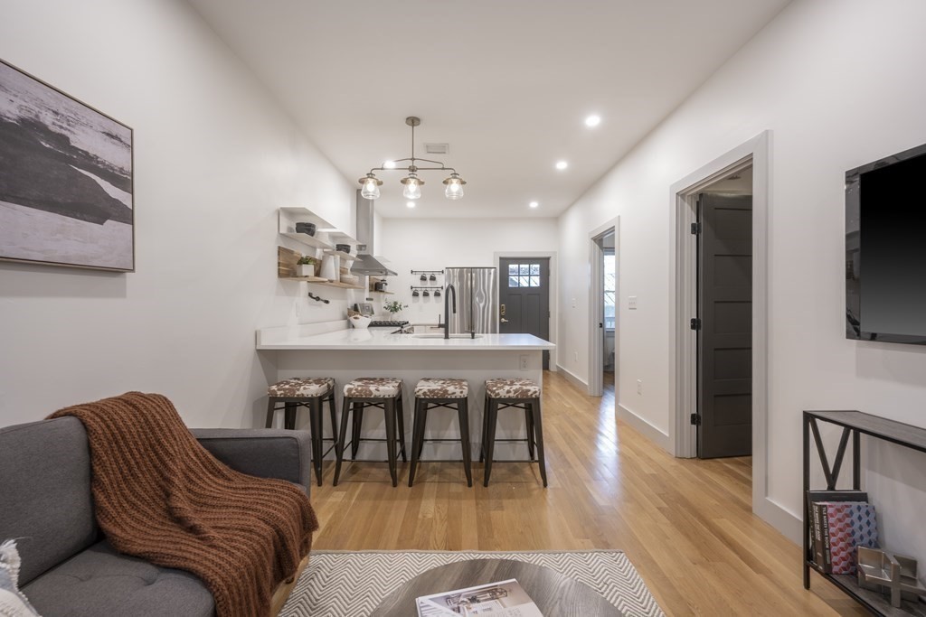 Beautifully renovated condo in a quiet, tree-lined East Boston neighborhood. Thoughtfully designed 3-bedroom, 2-bath home, comfortable living space and a private rear deck perfect for entertaining or relaxing outdoors. The open-concept kitchen features quartz countertops, a peninsula with seating, stainless steel appliances, and a sleek vent hood, flowing seamlessly into the living area. Spacious primary bedroom includes an en suite bath with a frameless big shower. Two additional well-sized bedrooms offer generous closet space, and a full guest bath off the main living area. Highlights include refinished hardwood floors, freshly painted interiors, recessed lighting, central air, and in-unit laundry. The unit also comes with deeded basement storage. Located within walking distance of MBTA stations, local parks and a variety of restaurants. This home offers the perfect blend of comfort, convenience, and East Boston charm. Open houses Saturday 1/31 and Sunday 2/1 both 11-1.