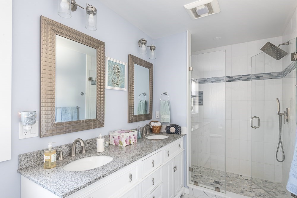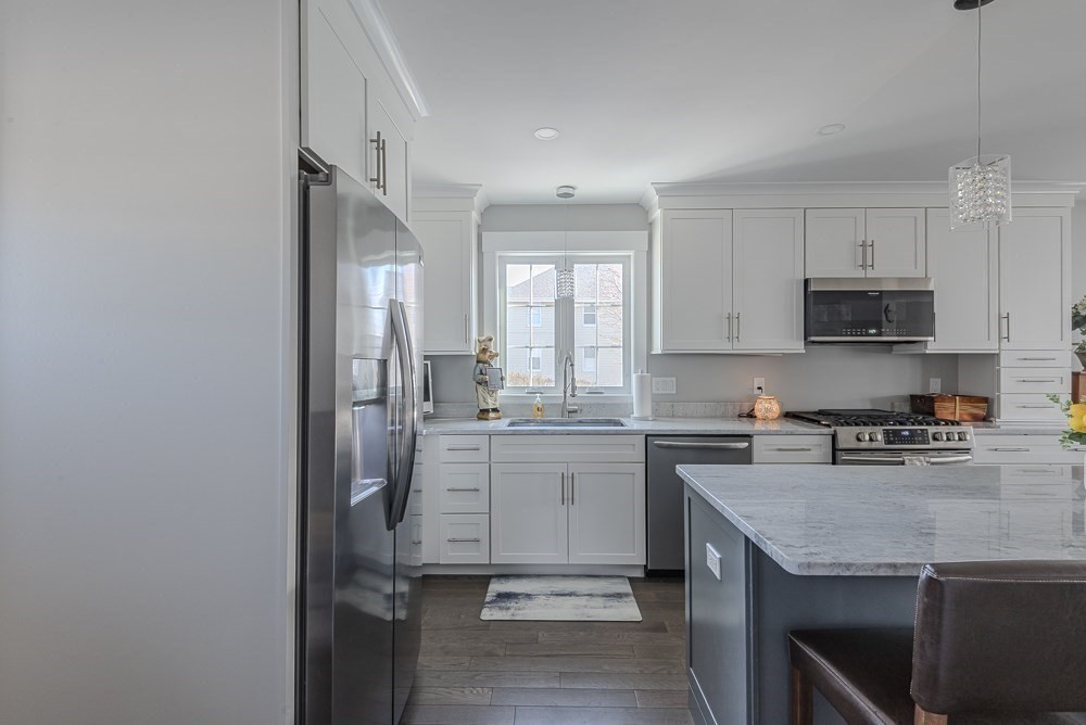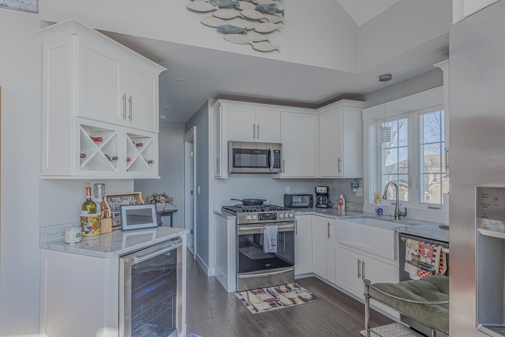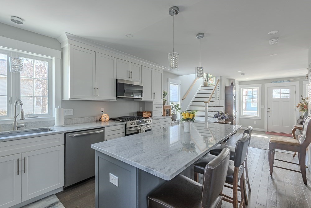Located at 102 Edgewater Rd, Hull, MA, this single-family residence presents an attractive opportunity to own a newer home (built in 2023) in great condition in the desirable Sunset Point area, The heart of this home resides in its thoughtfully designed upper deck and wall of windows to take in the views of the bay and World's End. The 2nd floor living room is impressive, defined by a high, vaulted ceiling that amplifies the sense of space and light, alongside a fireplace perfect for creating a warm and inviting atmosphere. The Master bedroom has a walk-in closet, & ensuite bathroom features a double vanity and tiled walk-in shower, offering both style and functionality. 2 Beautiful kitchens offer expansive stone countertops, perfectly complemented by the refined aesthetic of shaker cabinets adorned with crown molding; a large kitchen island provides ample space for both preparation and casual dining, while a wine cooler ensures your favorite vintages are always ready to be enjoyed.