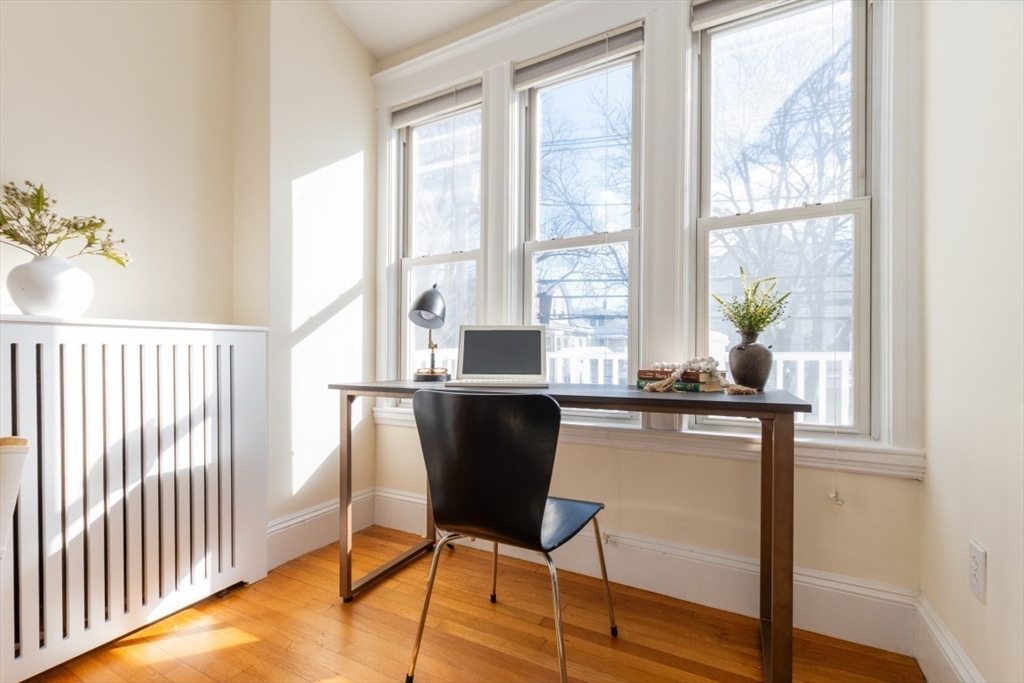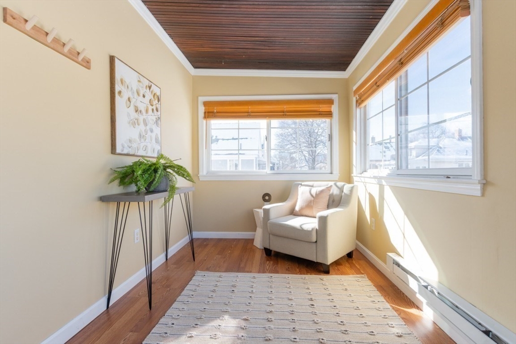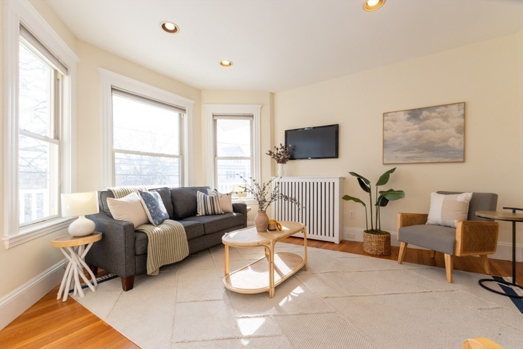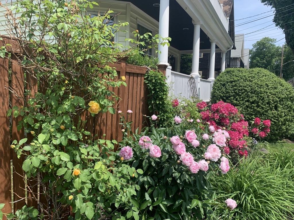 Flooded with natural light, this beautifully updated top-floor home sits in a charming two-family on a corner lot in East Arlington. Enjoy a private front and side entryway, exclusive use fenced yard w/patio, in-unit WD, a garage parking space and one additional off-street spot. The refreshed eat-in kitchen features newer quartz countertops, sink, fixtures, stainless steel appliances, and gas range. A formal dining room flows seamlessly into two gracious parlor-style living rooms with abundant windows, ideal for entertaining. Two well-sized bedrooms offer hardwood floors and great natural light. The renovated full bath includes heated floors and double sink vanity. An enclosed, heated back porch/sun room with windows on three sides provides wonderful versatility for office, playroom, studio, or cozy retreat. All just about a mile to Alewife and moments to Harvard, Davis, Porter, Route 2, and East Arlington’s beloved shops, cafés, Capitol Theatre, Spy Pond, & the Minuteman bike path.