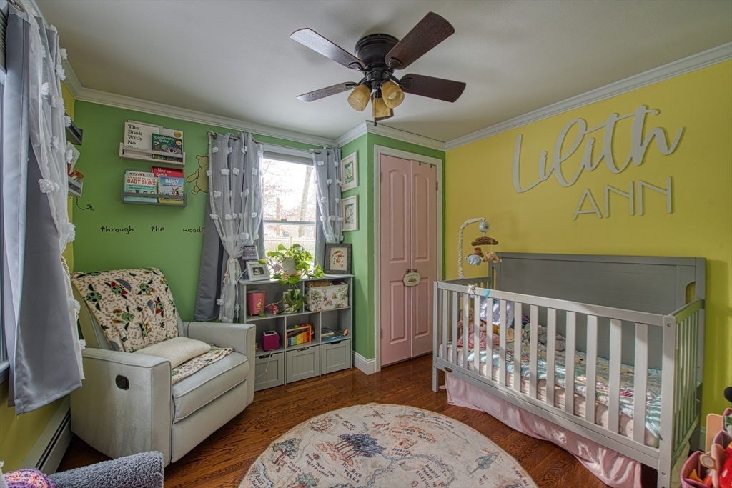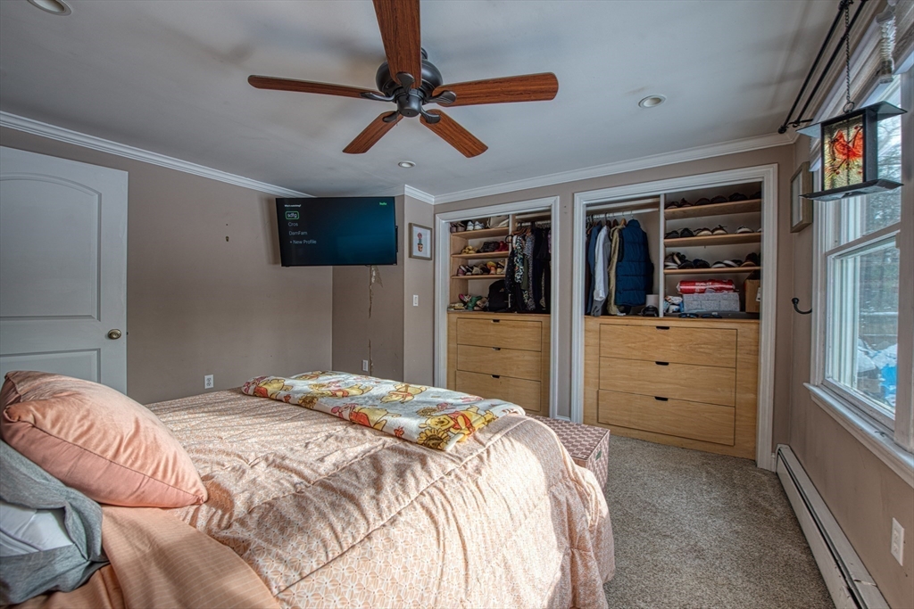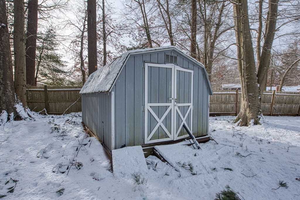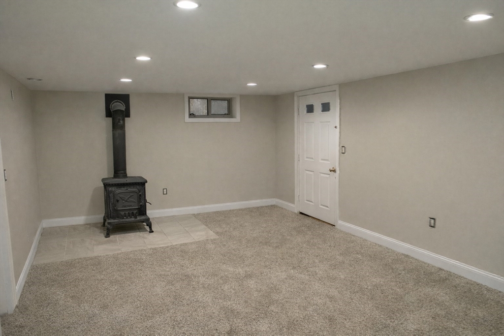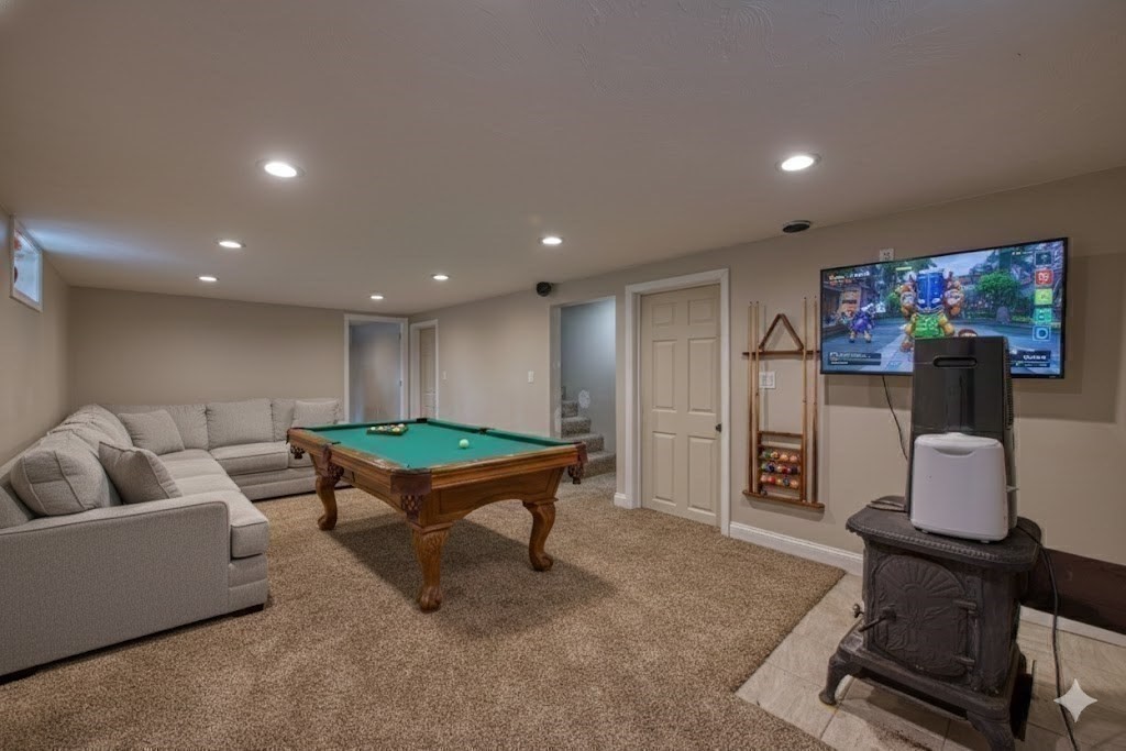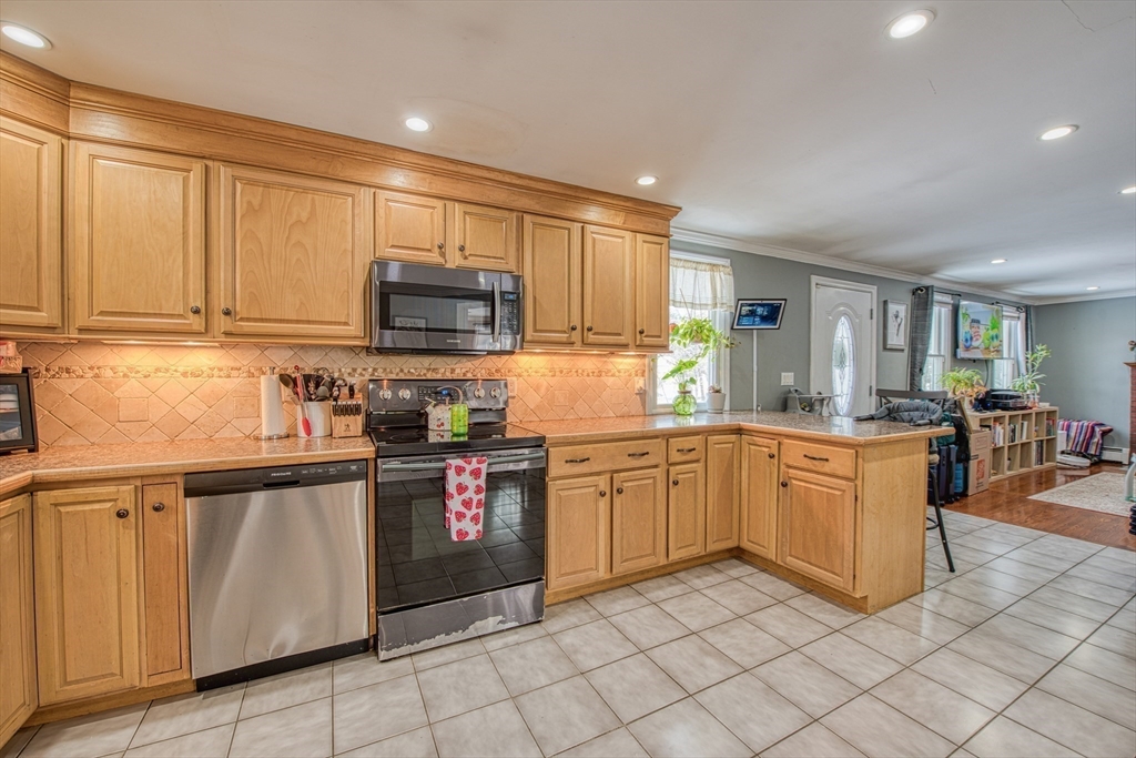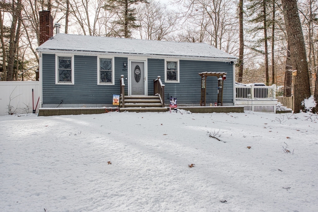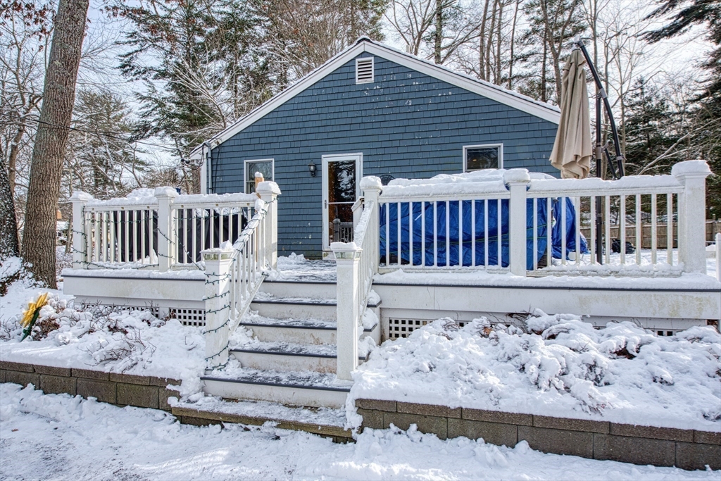 Walk to the Great River Preserves from this well-maintained ranch, ideally set on a private, wooded lot at the end of a dead-end street. Offering easy one-level living, the home features an open floor plan with hardwood floors, a brick fireplace, and abundant natural light throughout.The kitchen includes a tile backsplash, under-cabinet lighting, breakfast bar, and double sink, opening seamlessly to the main living space. Two bedrooms and a full bath complete the main level, including a primary bedroom with custom double closets and built in drawers.The finished lower level provides additional living space with a spacious family room featuring a wood-burning stove, along with a separate gym or office area ideal for privacy or remote work.Step outside to a maintenance-free composite deck overlooking a fully fenced yard, perfect for relaxing or entertaining. Conveniently located minutes from the commuter rail, walking trails, and local amenities. Seller to install a new three-bed Septic