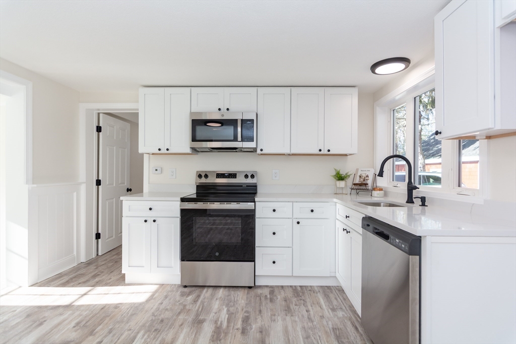 Beautifully sun-filled Cape in a desirable North Walpole location, offering timeless period charm with modern amenities. This home is on a beautiful lot with a peaceful, set-back feel near a budding agricultural school. Recent home updates include a brand-new septic system, many new windows, new garage doors, and freshly painted interior and exterior. The interior features a stunning kitchen with quartz countertops, new cabinetry, new appliances, and vinyl plank flooring. Original hardwood floors have been refinished, 2 bathrooms have been updated, and there is a convenient first-floor laundry room. Enjoy the warmth of an ornamental fireplace, beamed ceilings in the living and dining areas and a charming enclosed front porch. The finished rm in basement provides flexible space for a playroom or 2nd home office. This property also includes a barn with parking for two small vehicles and ample storage. Located in an ideal commuter location, close to the train and major highways to Boston.