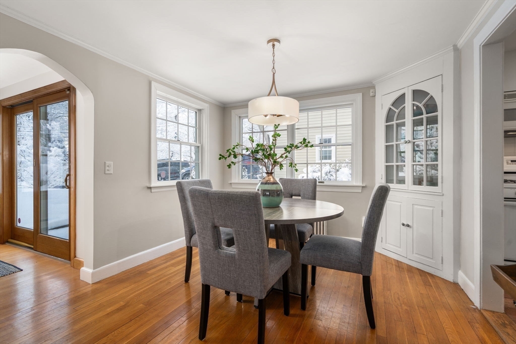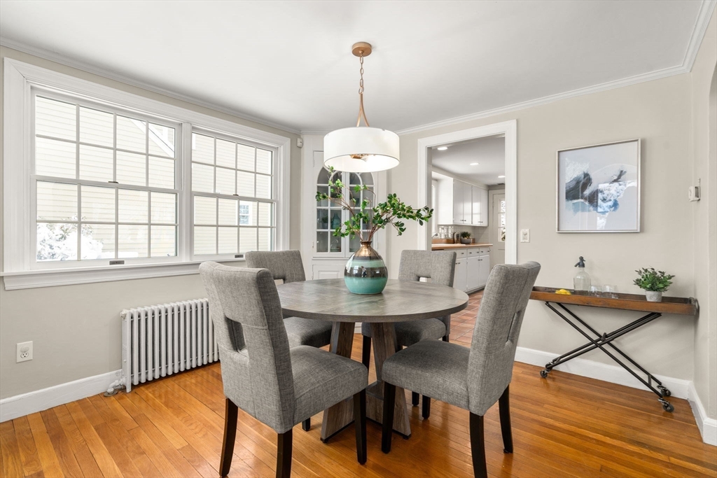 Nestled on a private island at the end of a quiet, family-friendly dead-end street, this delightful extended Cape offers four bedrooms, including a first-floor primary suite, and two fireplaces throughout.The eat-in kitchen flows seamlessly into the formal dining room, while the spacious living room, highlighted by a fireplace and adjoining sunroom opens via sliding doors to an outdoor patio, perfect for BBQs and entertaining. A cozy lower-level den with fireplace adds additional living space and charm.Upstairs, is a full bathroom and three bedrooms, one featuring a skylight, providing ample room for family and guests. Additional highlights include an attached garage, plus two off-street parking spaces.This charming single-family home is de-leaded and ideally located near conservation land, yet just minutes from the T, The Chestnut Hill Mall, The Street, Wegman's, Skyline Park, restaurants and more. Offering the perfect blend of suburban tranquility and urban convenience.