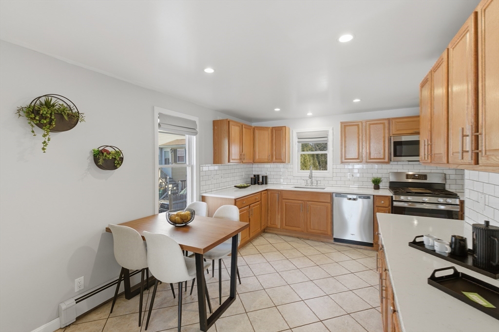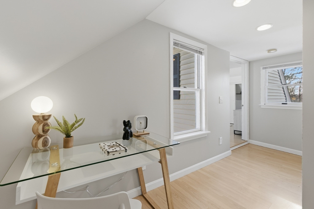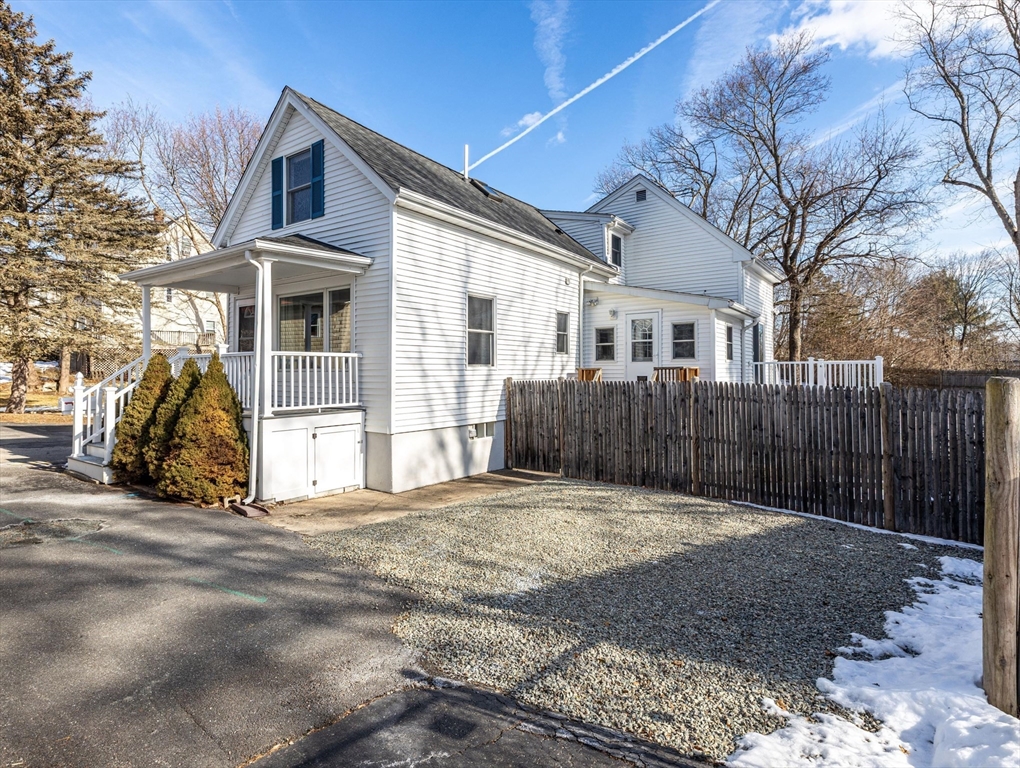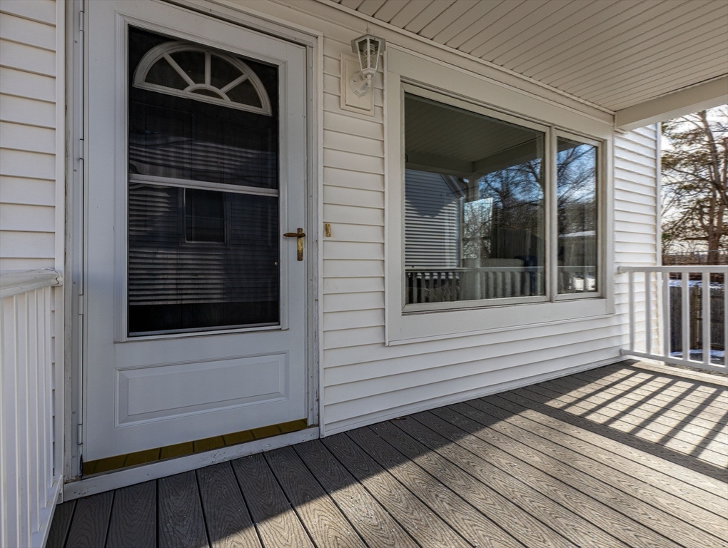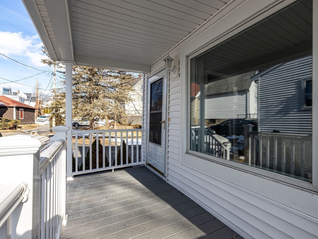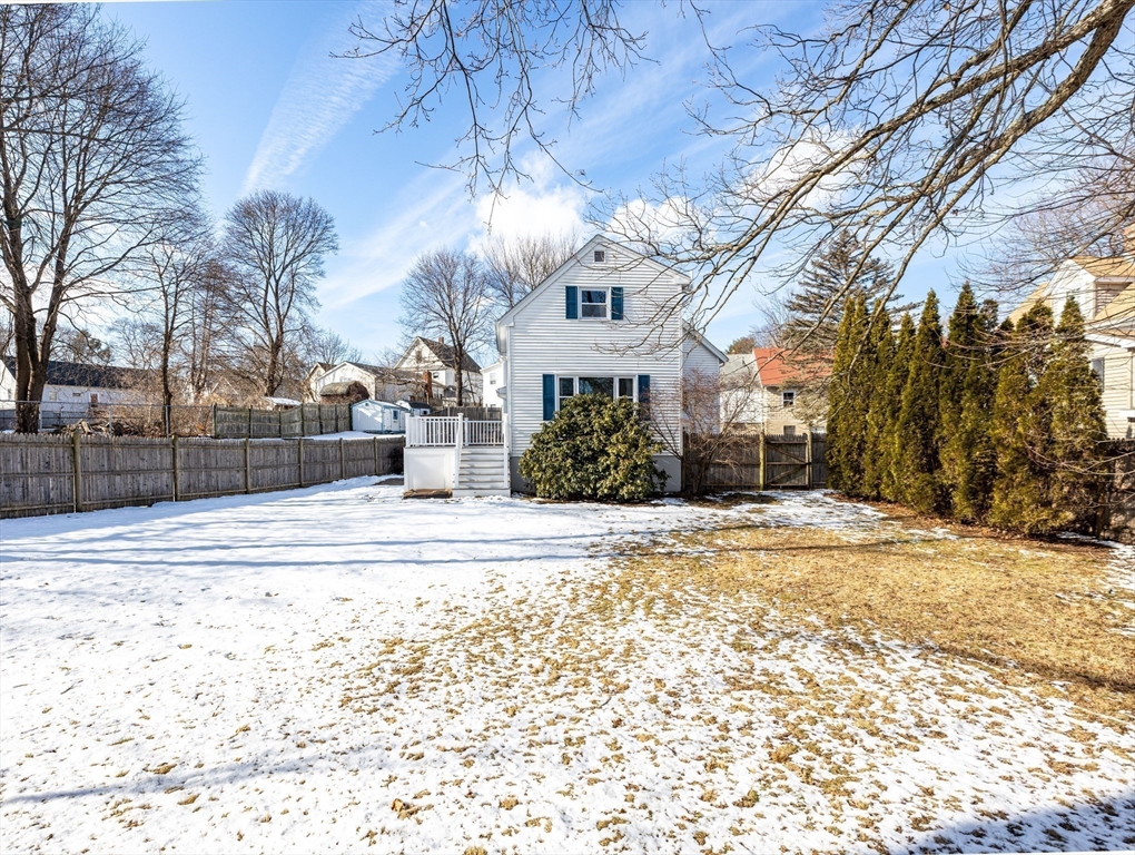Charming, sun-filled home with private, fenced-in backyard on a closed-end street. This move-in ready home welcomes you with a cozy front porch. Enter the home to find a comfortable living room leading to a warm & inviting updated kitchen with ample oak cabinetry, newer SS appliances & convenient mudroom with extra storage & separate entry. The heart of the first floor is the spacious, welcoming family room with abundant natural light. Sliding glass doors offer direct access to an oversized, composite deck overlooking the peaceful, fully fenced-in landscaped backyard with stone patio. Perfect for entertaining! The 2nd floor offers two large bedrooms with impressive closet space, modernized bath & additional office space. Spotless basement features a bonus room & laundry. Gas heat, newer roof, newer water tank, new W&D. Less than a mile to commuter rail & walking distance to downtown Norwood. This one is a must see! A perfect blend of privacy & convenience to all Norwood has to offer!