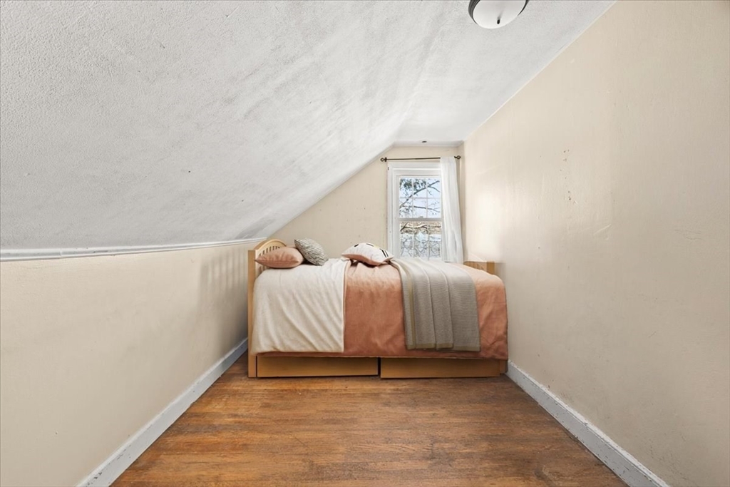 Welcome home to this charming 4-bedroom, 2-bath Cape-style home set on over a quarter-acre lot, tucked away on a dead-end street just seconds to I-93. This home offers a 1st floor bedroom and ready to finish hardwoods! The kitchen features updated appliances and flows seamlessly into a formal dining area with a convenient pass-through window, great for hosting holidays or casual dinners. The living room is full of character, highlighted by beautiful beamed ceilings that add warmth and a sliding glass door that brings you to the deck overlooking the yard!! The 1st floor bedroom offers flexibility & can easily serve as a home office, guest room, or playroom. Upstairs, you’ll find a spacious main bedroom along with two additional bedrooms, offering ample space and storage. The location is hard to beat!!! Variety of shopping and dining options near by as well. This is the one you’ve been waiting for!