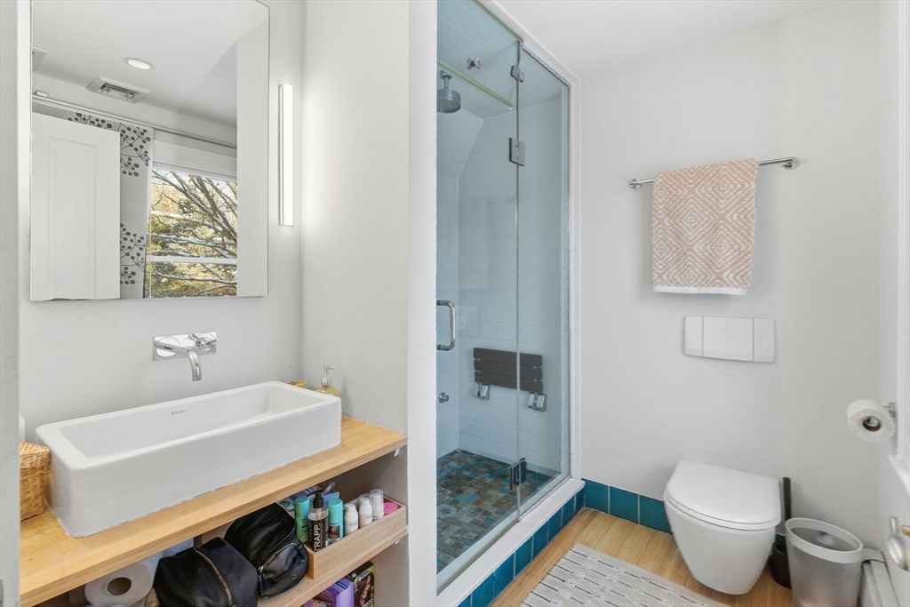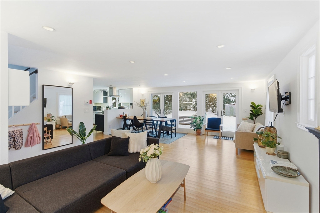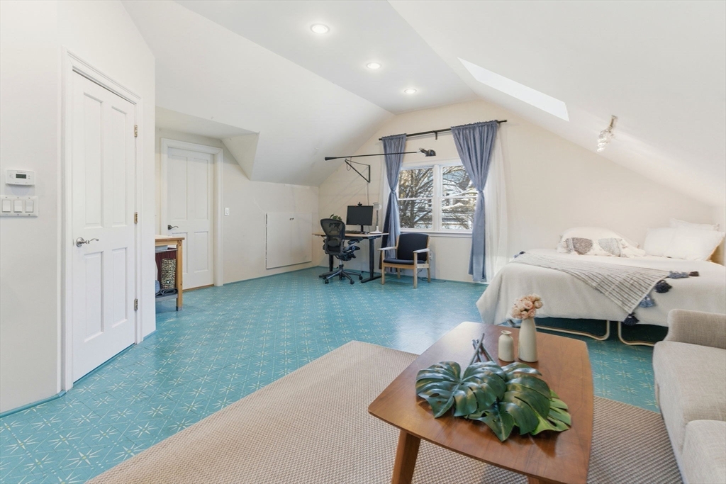 Sun-filled 4-bedroom, 3.5-bath home where a classic Colonial open-concept layout meets European-style design, set on a quiet Lexington street. It features bamboo flooring and recessed lighting throughout. The modern kitchen includes stainless steel appliances and opens to the dining and living areas with a wood-burning fireplace. Two sets of French doors lead to a brick patio and a large, level, private backyard. An office and half bath complete the main level, along with an attached heated 2-car garage.The second floor includes an en-suite primary bedroom, two spacious bedrooms, second full bath, laundry, and an open loft with vaulted ceiling and skylight. The studio above the garage offers a fun, creative design with vaulted ceiling, skylights, extra sink, third full bath, and a separate entrance. A finished lower level provides additional space for family activities. Conveniently located near shopping, highways, conservation land, a nearby pond, and a bike path.