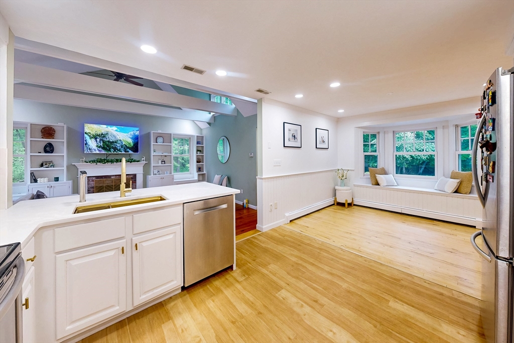 Location, location, location! Renovated single-family steps from top-rated Acton-Boxborough High, RJ Grey Jr High, two primary schools, KinderCare daycare, and Stop & Shop—all along the same road. Easy access to Route 2. Set on a scenic lot framed by stone walls and nature, this home blends classic charm with modern updates. New appliances (2025) include refrigerator, dishwasher, and induction range. Interior renovations (2023) include modern vent hood with new chimney, vanities, recessed lighting, sleek countertops, filtered instant hot water, new sink, fresh paint. Finished basement (2025) offers home theater/playroom with interior stairs and bulkhead walkout. Radiant heat in family room and mudroom (2017). Stunning great room with beamed cathedral ceilings and French doors to deck & bluestone patio. Fireplaced living, formal dining, casual dining w/ bay window, private office. Updated baths + spacious primary suite, 2018 AC and UV Air Purifier, 2017 boiler, 2 fireplaces & more!