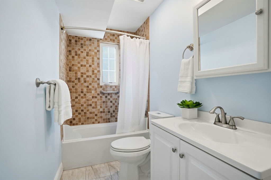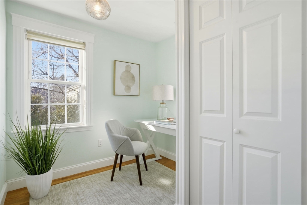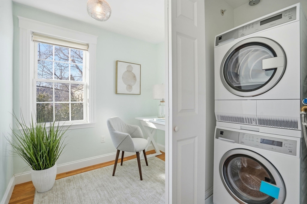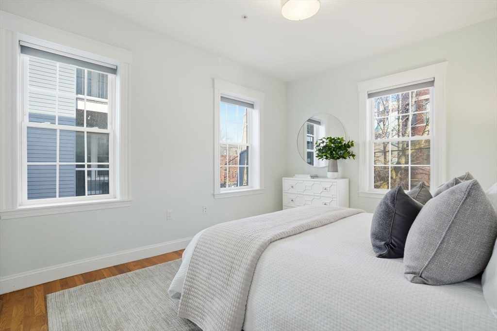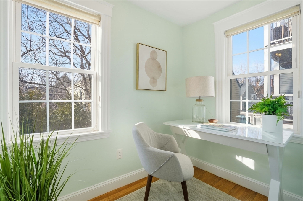 Located just three blocks from the restaurants, shops, and Red Line T in Central Square, this oversized one-bedroom condominium offers an ideal blend of city convenience and comfortable living. Set on the second floor of a charming 5-unit brick building, the home is filled with natural light from a series of large windows spanning the length of the unit. The expansive living area provides ample space for entertaining, dining, and everyday relaxation. Toward the rear, the eat-in kitchen features stainless steel appliances and opens directly to a private porch—perfect for morning coffee or evening unwinding. A thoughtfully designed office nook incorporates in-unit laundry, while the residence also includes private basement storage. Renovated approximately 10 years ago, the unit showcases hardwood floors throughout, high ceilings, and a smart, efficient layout.