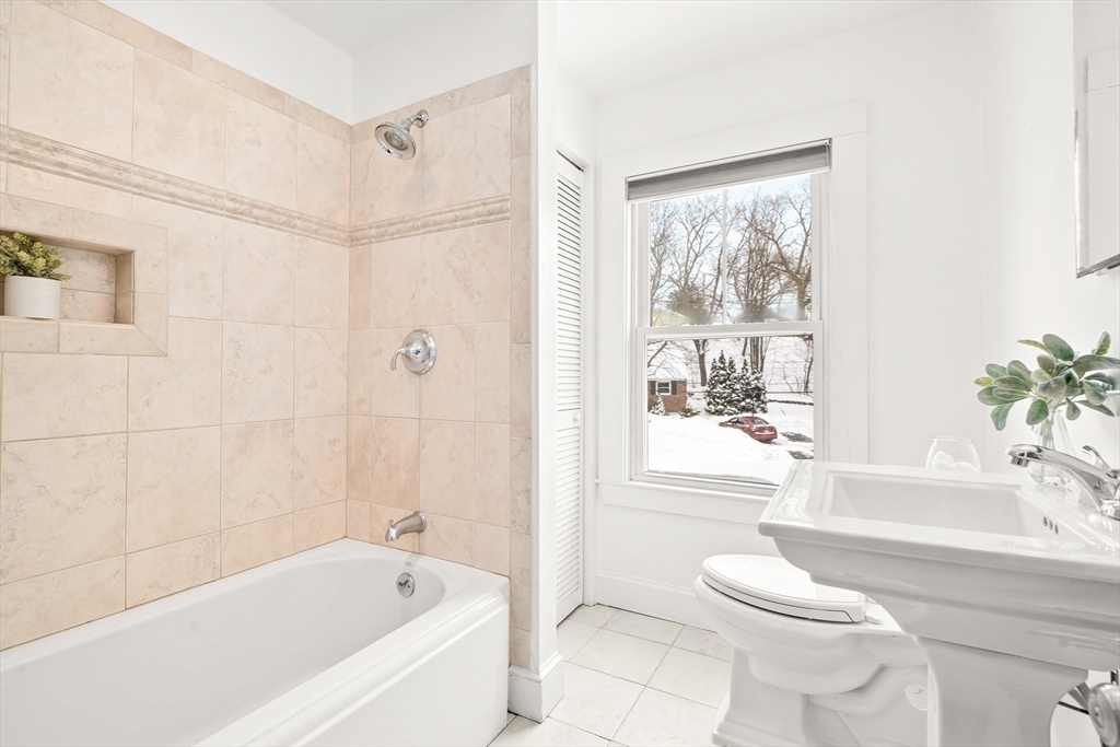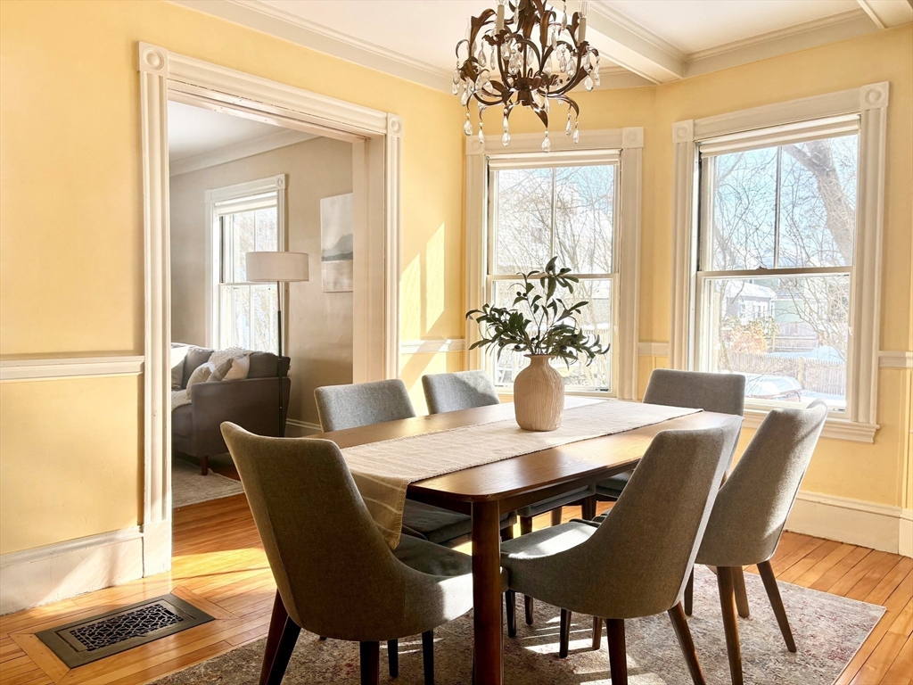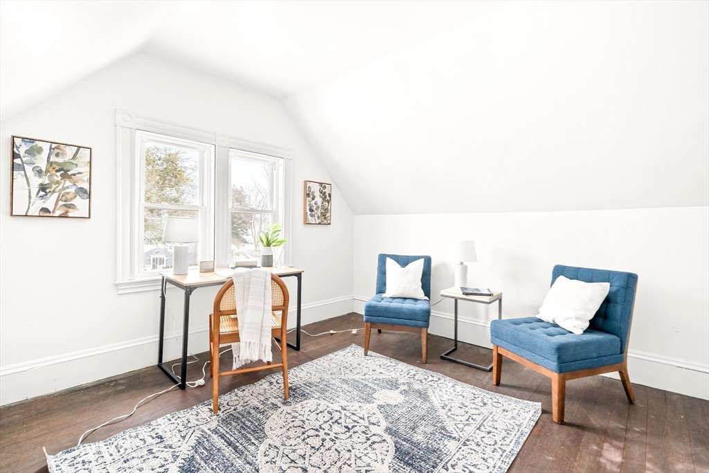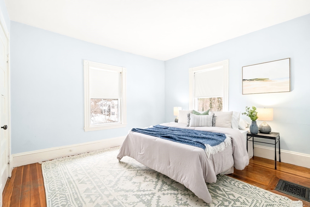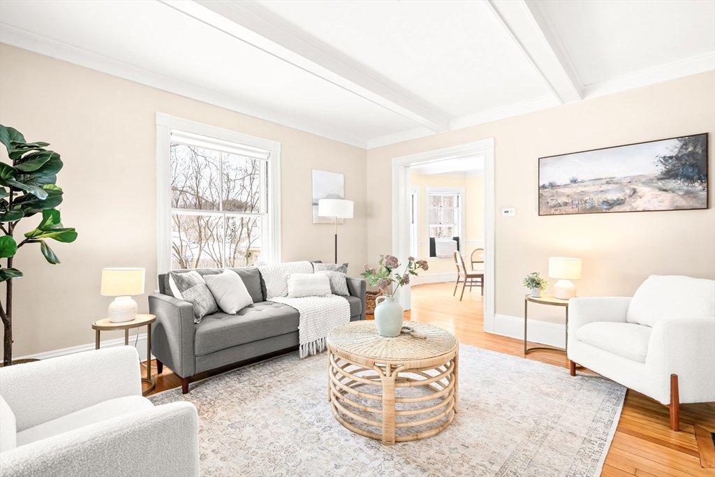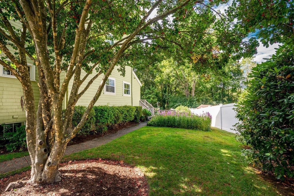 A quintessential New England Colonial offers timeless charm and a welcome presence, introduced by an inviting front porch that sets the tone for what lies within. The gracious foyer opens to a sunlit living room with warm wood floors and classic details, creating an inviting space for easy living. Pocket doors lead seamlessly into the dining room, where a fireplace and a beautifully curved bow window add architectural character and a sense of tradition. The kitchen connects effortlessly to cascading decks and a picturesque backyard that abuts conservation land with Horn Pond Brook, providing a peaceful and natural backdrop. Upstairs offers comfortable bedrooms and a full bath arranged for privacy and ease. The walk-up attic features a finished room and a separate foyer -awaiting heat for expansion potential. A walk-out basement offers additional flexibility for storage or future use. Outdoor living is enhanced by multiple decks and porch spaces designed for enjoying the serene setting