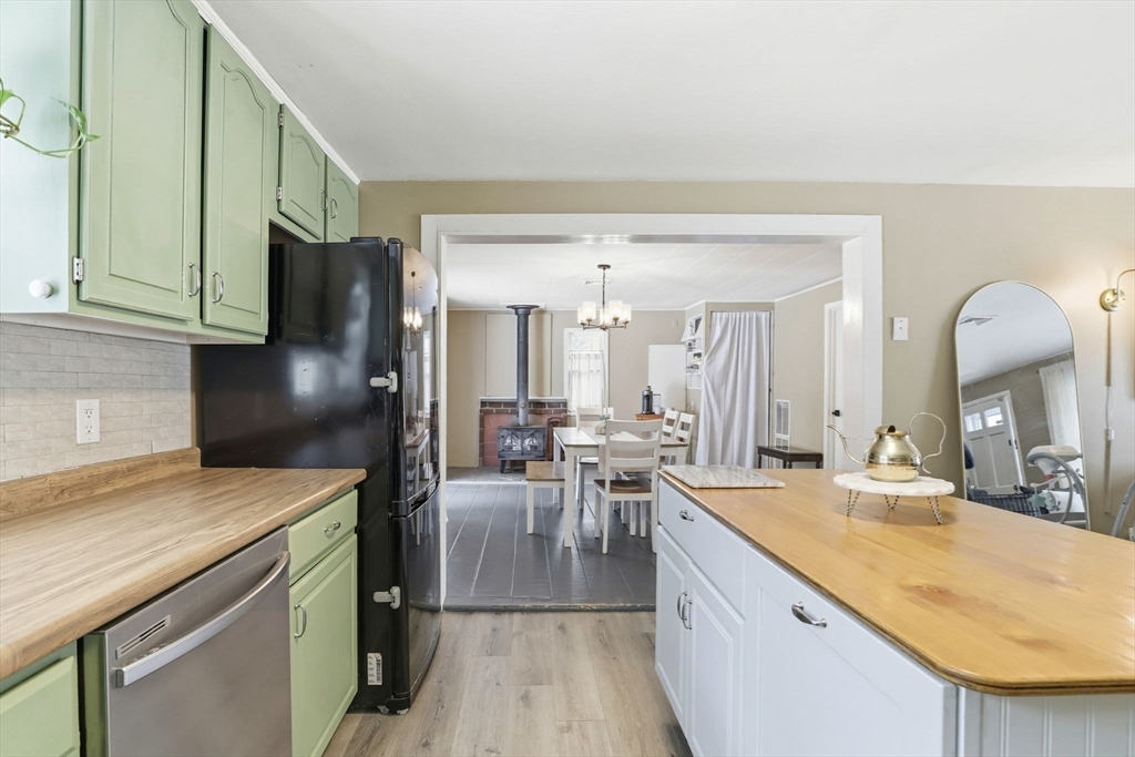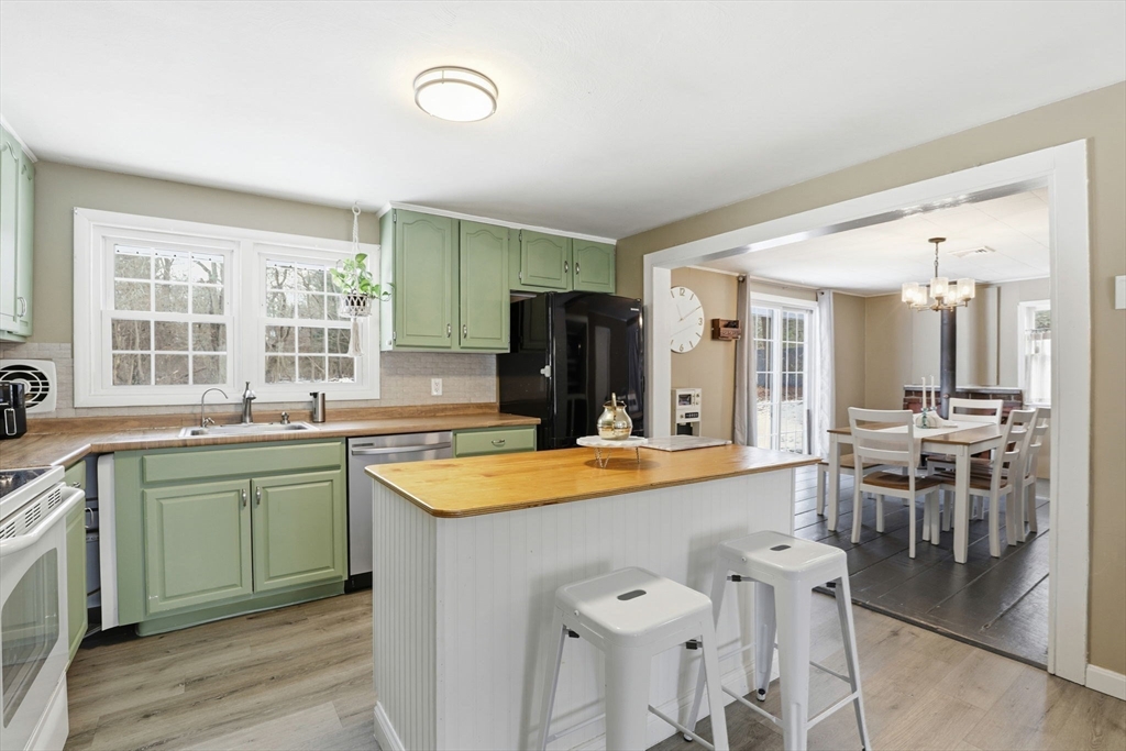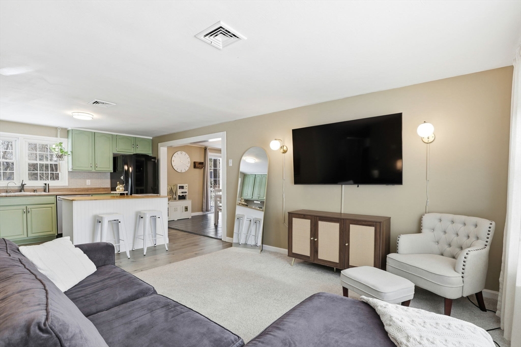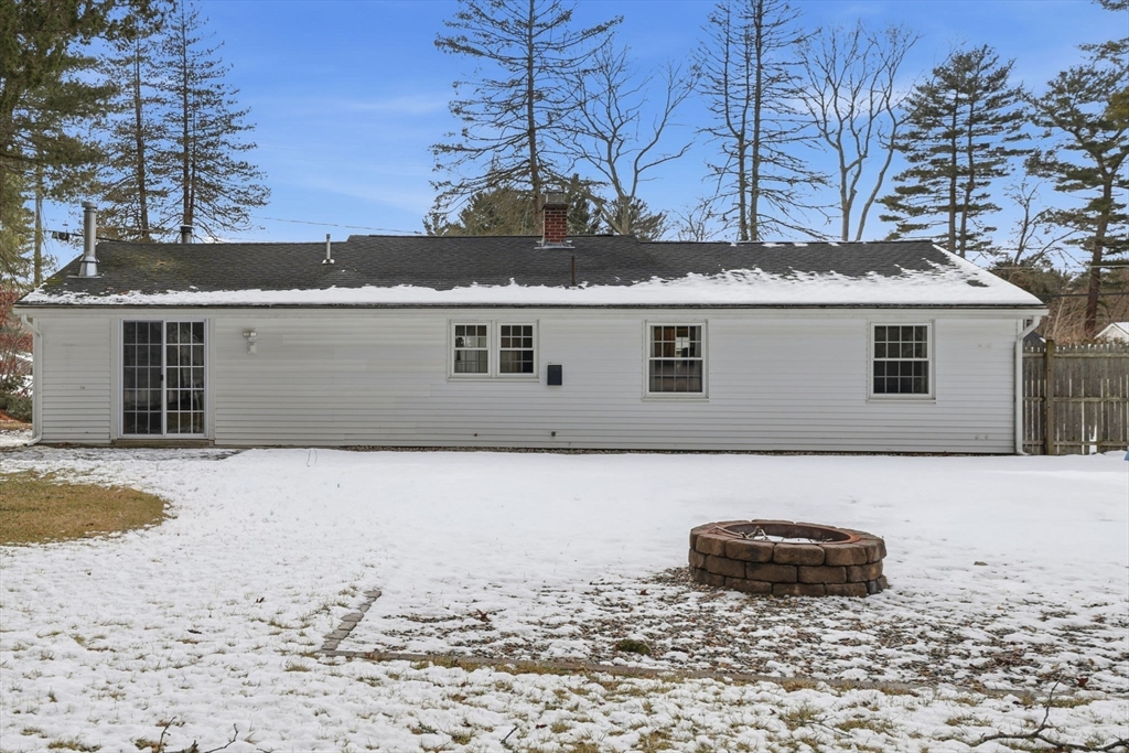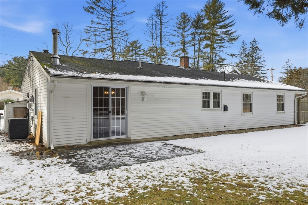 Move-in ready charming ranch with a new heating and central air system installed, offering easy one-level living in a desirable neighborhood close to schools, ball fields, shopping, and highways. The large kitchen features a butcher-block island with seating and a newly installed dishwasher. The kitchen flows directly into a versatile bonus room with a wood stove and a built-in bar/pantry—ideal for a dining area, den, home office, or family room—with sliders to the patio. Three good-sized bedrooms offer ample closet space. Additional updates include a freshly painted interior, newer carpets and flooring, a separate laundry/storage room, a newer oil tank, and an enlarged storage shed. Step outside to a patio and a large, private wooded backyard—perfect for relaxing, entertaining, or cozy nights by the fire pit. Town water/sewer. A great opportunity for easy, low-maintenance living in a fantastic neighborhood.