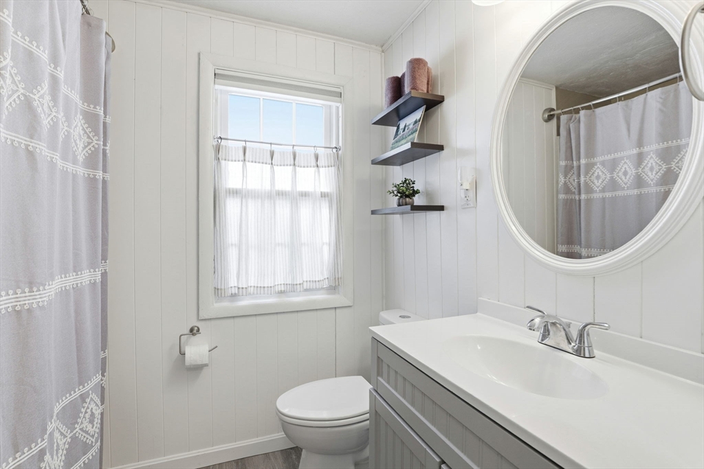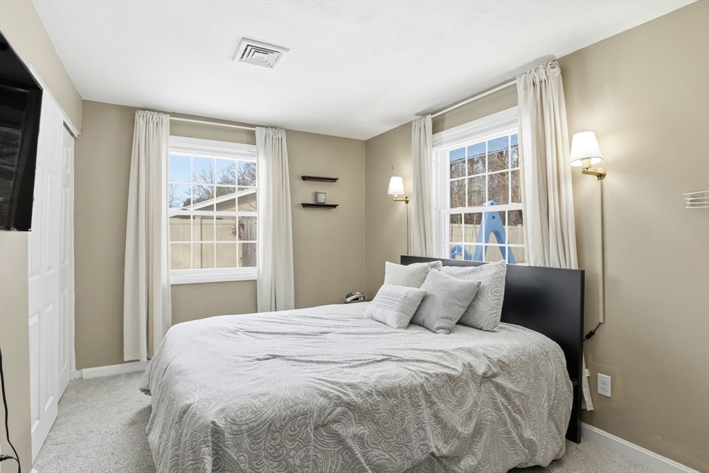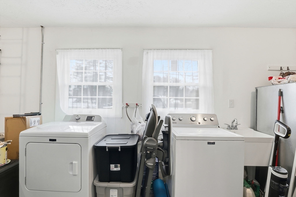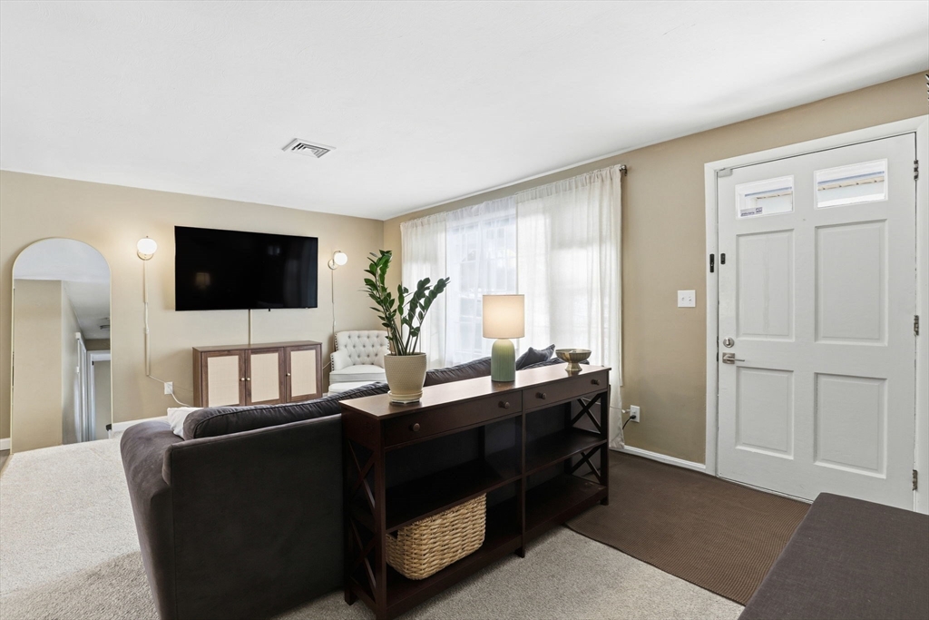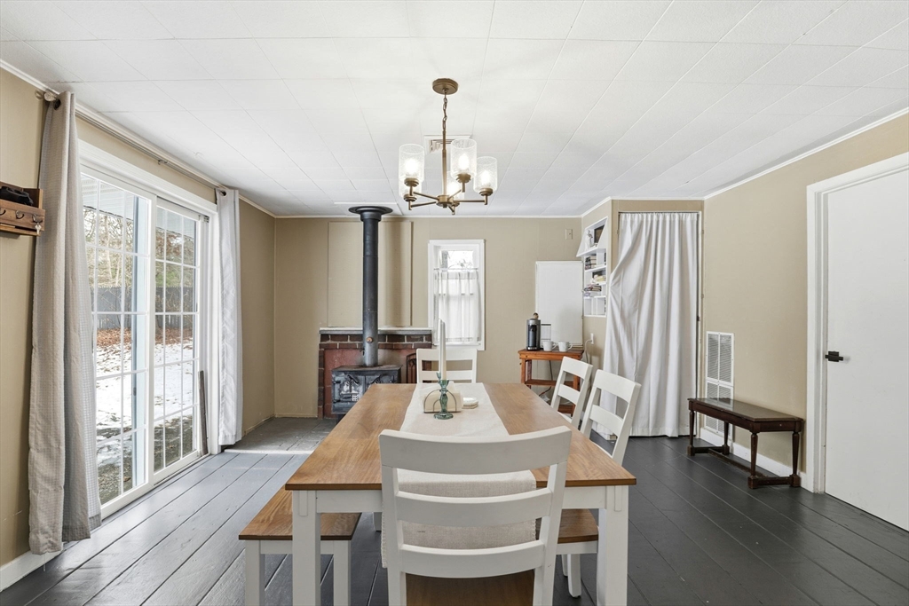 Move-in ready charming ranch with a new heating and central air system installed, offering easy one-level living in a desirable neighborhood close to schools, ball fields, shopping, and highways. The large kitchen features a butcher-block island with seating and a newly installed dishwasher. The kitchen flows directly into a versatile bonus room with a wood stove and a built-in bar/pantry—ideal for a dining area, den, home office, or family room—with sliders to the patio. Three good-sized bedrooms offer ample closet space. Additional updates include a freshly painted interior, newer carpets and flooring, a separate laundry/storage room, a newer oil tank, and an enlarged storage shed. Step outside to a patio and a large, private wooded backyard—perfect for relaxing, entertaining, or cozy nights by the fire pit. Town water/sewer. A great opportunity for easy, low-maintenance living in a fantastic neighborhood.