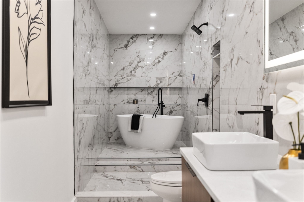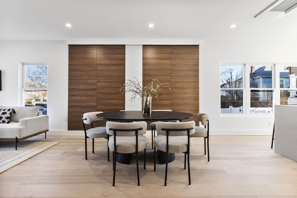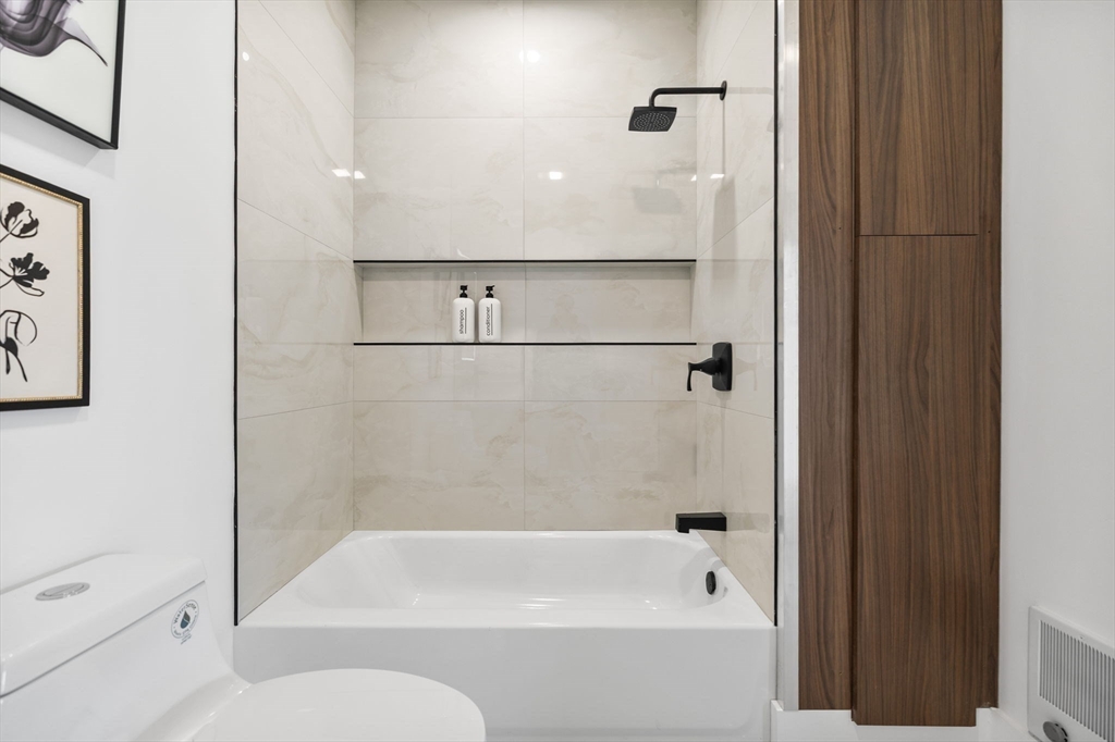 This thoughtfully renovated home offers a comfortable, modern layout across two well-designed levels. The main floor features an open living, dining & kitchen space that feels warm and inviting, ideal for hosting or unwinding after a long day. Hardwood floors, recessed lighting, a quartz island, sleek flat-panel cabinetry, and stainless steel appliances create a clean, timeless aesthetic. Sliding glass doors lead to a private rear deck overlooking an exclusive backyard, perfect for casual evenings outdoors. A bright guest bedroom and full bath complete this level. Downstairs, the entertainment area flows into a cozy family room with a contemporary fireplace, perfect for movie nights or working from home. The primary suite features two walk-in closets and a spa-inspired bath with a freestanding soaking tub. A third bedroom, laundry room, and two tandem parking spaces add everyday convenience. Moments from Medford/Tufts Station, Davis Square routes, and Mystic River paths.