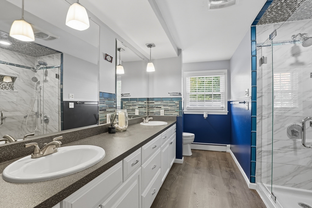 Looking for 1-level living, multi-generational space, or potential handicap accessibility? This sprawling ranch has it all! Recently updated with stunning hardwoods throughout, this corner-lot home is perfect for entertaining. Inside are 4 spacious bedrooms, including a primary suite with WIC and ensuite. A full bath serves the other 3 beds, plus a guest half bath and large laundry room. The beautiful eat-in kitchen opens to the dining room and sunken family room. You’ll also find a large living room with a grand stone fireplace and deck. The lower level features a private guest suite w/ full bath—ideal for in-home business, gym, playroom, or separate living. The huge basement w/ new epoxy floors offers endless potential, with interior and 2-car garage access. Solar panels keep electric costs low, while the fenced backyard includes irrigation, outdoor lighting, a pergola, and a large patio. Close to shopping, highways, churches and hospitals.
