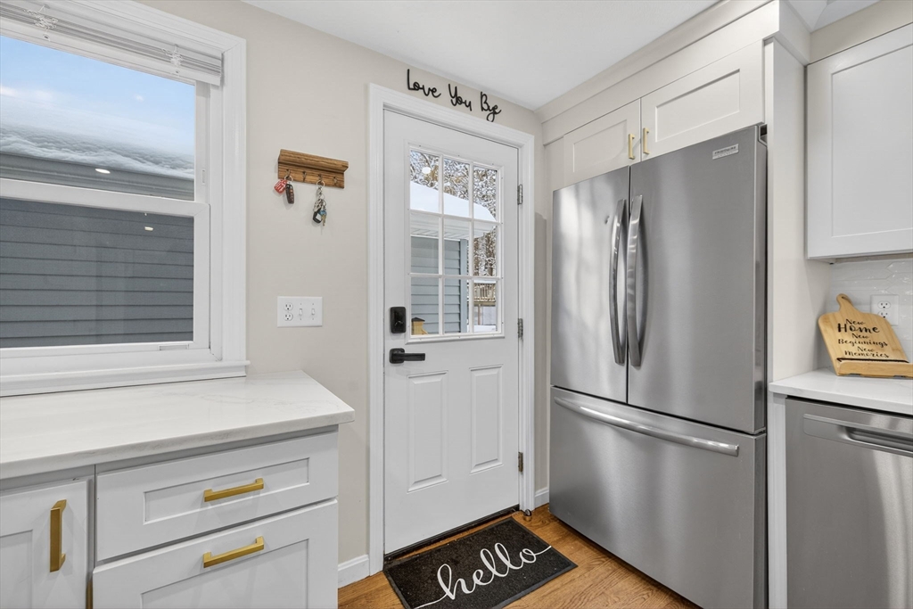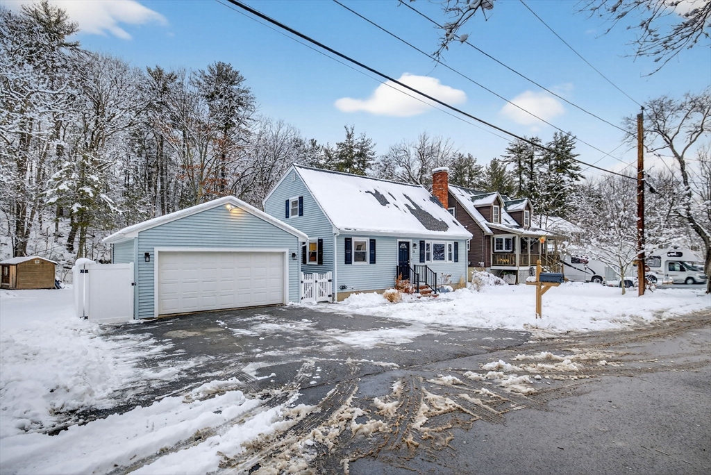 Welcome to this inviting Cape-style home set on over half an acre in Billerica, blending comfort, character, and everyday functionality. The updated kitchen and dining area anchor the home with stainless steel appliances, upgraded countertops, gold fixtures, and a peninsula with breakfast bar seating—perfect for entertaining. The dining space offers additional cabinetry and room to gather, while hardwood floors flow seamlessly through the main living areas. A cozy living room with fireplace creates a warm, welcoming atmosphere. The first-floor bedroom offers flexibility and convenience, while upstairs features three additional bedrooms with ample closet space. Two beautifully updated full bathrooms showcase tiled showers and modern finishes. The finished lower level adds valuable living space with a spacious family room and bonus home office. Complete with a fenced-in yard and detached two-car garage, this home delivers space, style, and versatility in a prime setting.