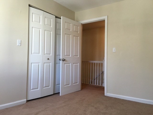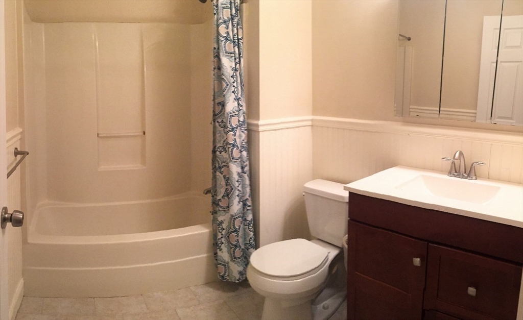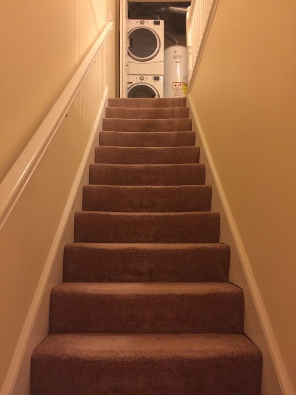 Bi-level townhouse-style unit available September 1, 2026, featuring a spacious and functional layout. Main level offers a bright living and dining area with hardwood floors, a fully equipped kitchen with gas stove and dishwasher, and a convenient half bath. Second level includes two bedrooms, a full tiled bath, and in-unit laundry, with carpeted bedrooms for comfort. Enjoy central air conditioning and heat and one off-street parking spot.