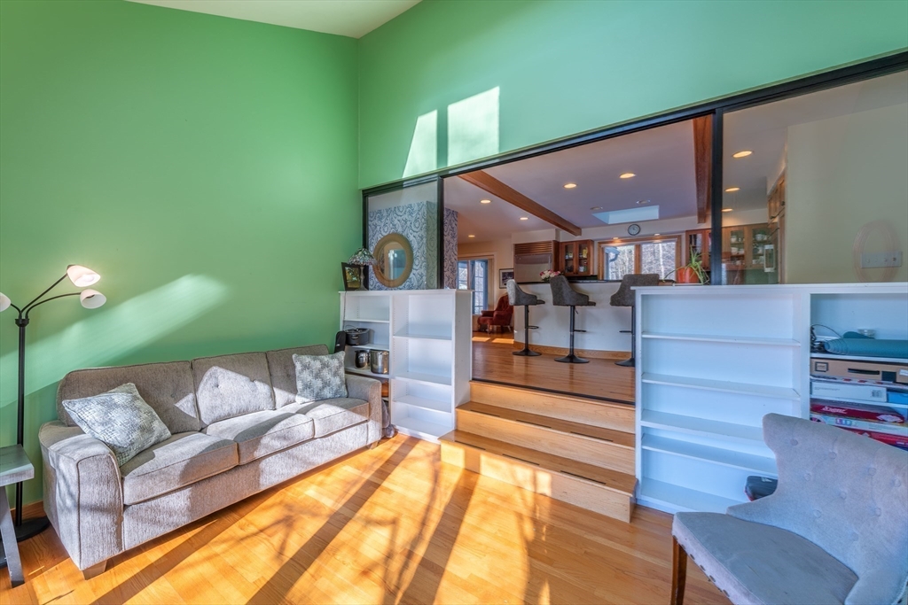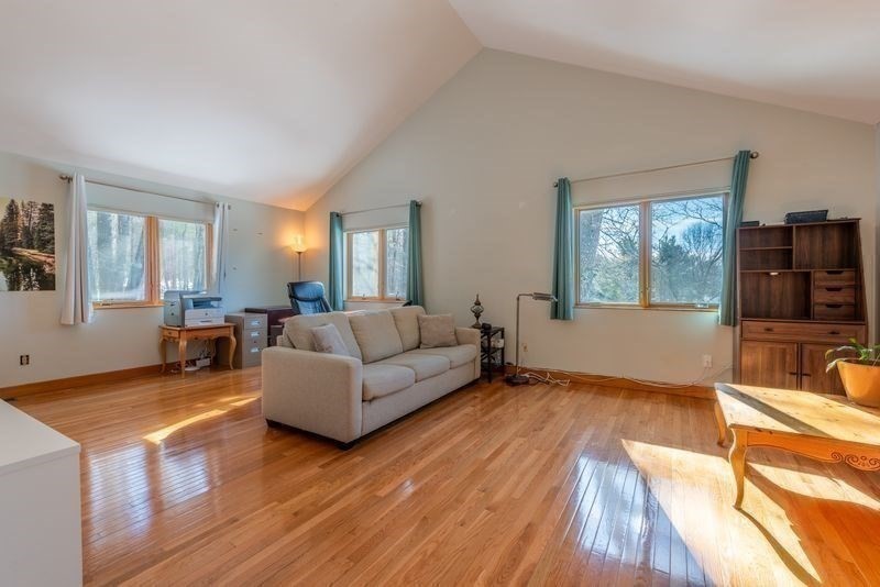 Tucked away at the end of a quiet cul-de-sac, this spacious contemporary home offers privacy, comfort, and convenience on 1.54 acres in the highly desirable Amherst Woods. Enjoy a serene setting while remaining close to all area amenities. The main level is designed with space for everyone, ideal for everyday living and entertaining. Open kitchen features an island and cherry cabinetry, flowing seamlessly into the dining room. A large, sun-filled living room showcases cathedral ceilings, cozy fireplace, and direct access to the deck. Additional highlights include a four-season porch, loft/office, sunken family room, 2 full bath, 3 bedrooms. Upstairs, the expansive primary suite offers a walk-in closet and full bathroom. The lower level includes a half bath/laundry room, finished room perfect for a home gym, complete with a top-of-the-line Endless Pool (negotiable) for year-round swimming. A two-car garage. Come experience the space, privacy, and lifestyle you've been waiting for!