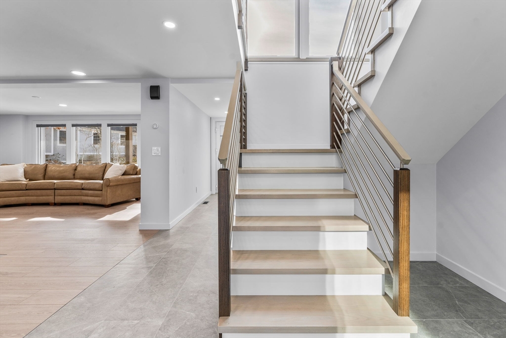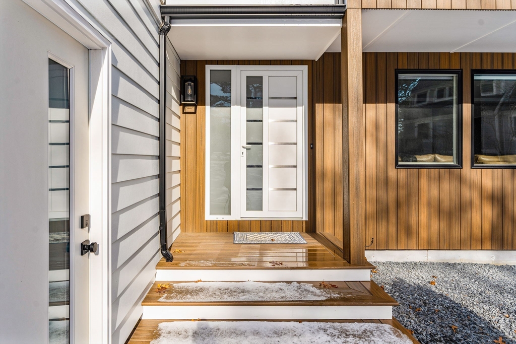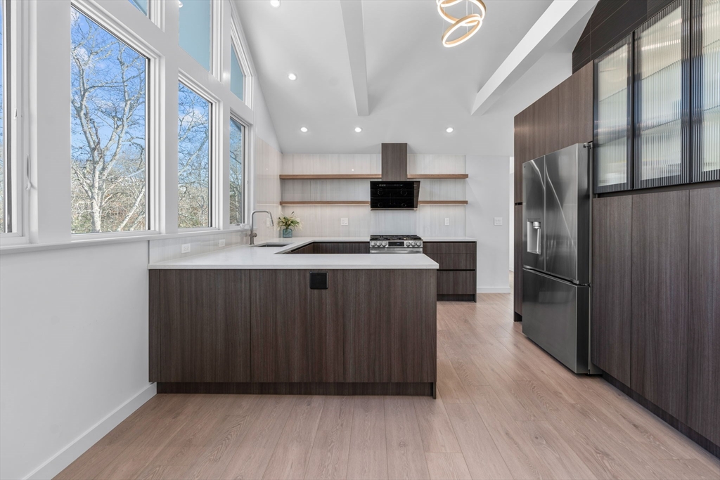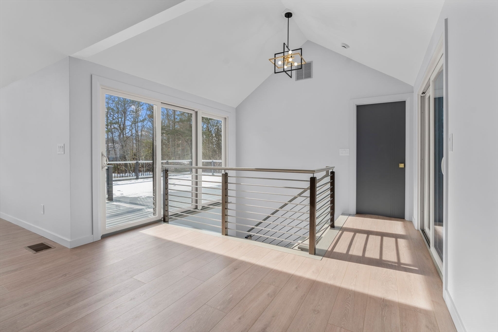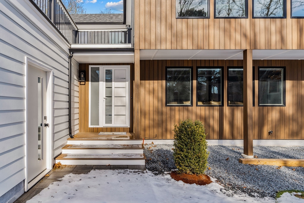 Expect the unexpected as you enter into this totally recreated property. The past has been replaced with a clean, sleek and contemporary feel both on the interior and exterior. The entranceway showcases the handsome modern stairway which complements the new design within. The lower level contains an open family room, recreation area and kitchenette, separate guest ensuite as well as office space, laundry and mudroom. Ascending the stairway to the main level, expanses of glass capture the great natural lighting. The open floor plan provides an extensive living area combining the kitchen, dining area and living room with a beautiful wood fireplace as a lovely centerpiece, and a new half bath has been added. The primary suite as well as two other sizable bedrooms and bath complete this level. There are multiple points within the home granting easy access to several decks offering wonderful opportunities for entertaining or enjoying private time outdoors.