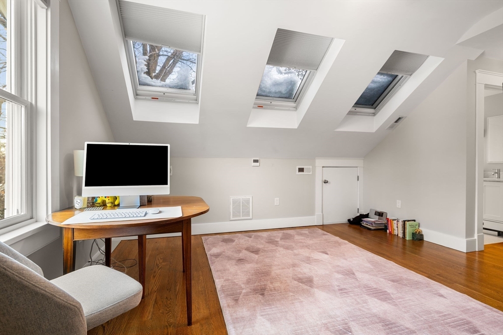 Pristine townhome on Brattle Circle, offering a rare blend of privacy, space, and location. Tucked away on a quiet private cul-de-sac, this beautifully designed residence spans four full levels and lives like a single-family home. The main living level features an open floor plan, a modern kitchen, and elegant dining area that flows into the sun-filled living room with gas fireplace. Upstairs, the primary suite includes a luxurious en-suite bath, with an adjacent office or additional bedroom offering flexibility for work or guests. The third floor hosts a spacious bedroom with three skylights and its own en-suite bath, creating a bright and private retreat. The lower level provides versatile bonus space ideal for a play area, gym, media room, or additional bedroom, complete with a full bath. Outdoor spaces are equally compelling, with an enclosed patio, a charming front courtyard, and a park-like setting that makes the home feel both connected and serene.