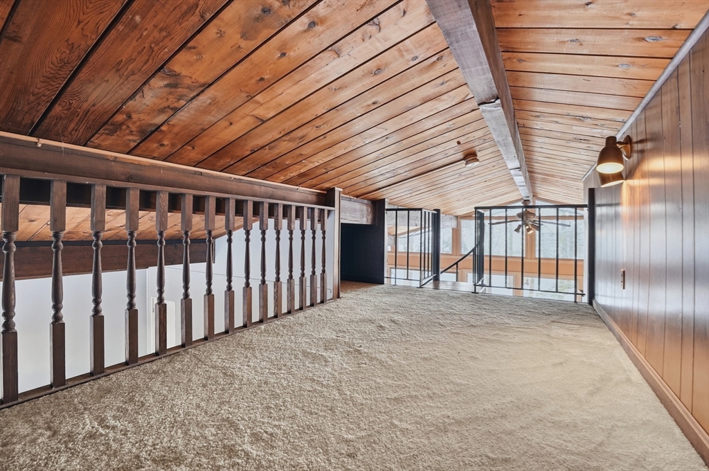 Rare treasure 3-bedroom 2.5 bath contemporary haven with spectacular panoramic views of the river nestled amongst carefully selected remnant of mature pine trees. Enjoy the cross-river breeze of the spring and summer or embrace the warmth of the dual fireplaces as your peer into a winter wonderland. The vaulted tung and groove beamed ceilings present a cabin affect. The custom kitchen with its open dining room concept offers granite counters, a sizeable island with easy pull-out drawers, double oven range and stainless appliances. The cabinetry offers a tremendous amount of storage with additional pantry consideration. New plush carpeting is located in the primary suite with personal bath as the guest bedrooms share a jack and jill modern bath. Entering from the heated garage you will find a cedar closet, half bath/ laundry as well as a fireplaced family room with slider to a screened in patio. This home rests upon one of the largest lots on the cul-de-sac. Roof 2025, Septic 2022