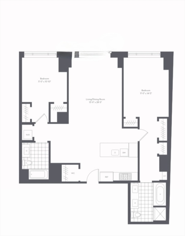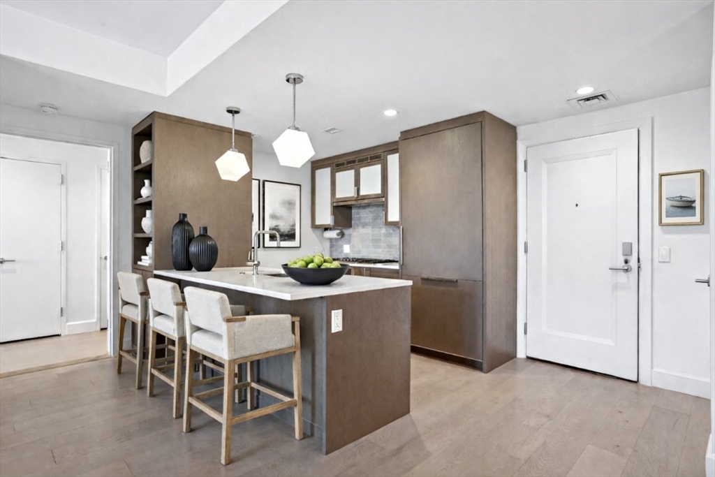 This well-designed two-bedroom, two-bath residence offers approximately 1,300 square feet of functional, well-proportioned living space with defined living and dining areas and exceptional storage throughout. The kitchen features custom cabinetry, paneled appliances, quartz countertops, a wine refrigerator, and a large island with seating for four. Adjacent space accommodates formal dining or a flexible work-from-home setup. The layout flows into a separate living room, where large windows allow you to enjoy harbor surroundings from your lounge chair. Two spacious, bookend bedrooms provide privacy and separation. The primary suite fits a king-size bed and includes multiple closets and a spa-inspired bath and linen. Additional features include in-unit laundry, a walk-in pantry, and extra storage. Residents enjoy full-service living at Lovejoy Wharf with 24-hour concierge and doorman services, valet parking, an on-site engineer, and over 10K sf of amenities including a fitness center