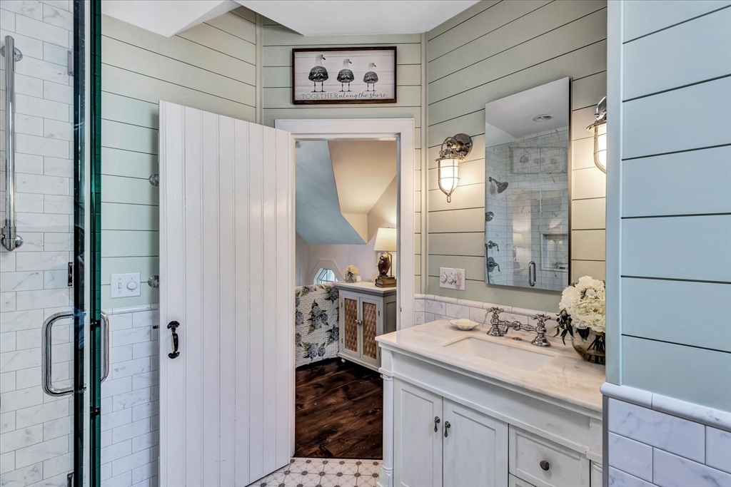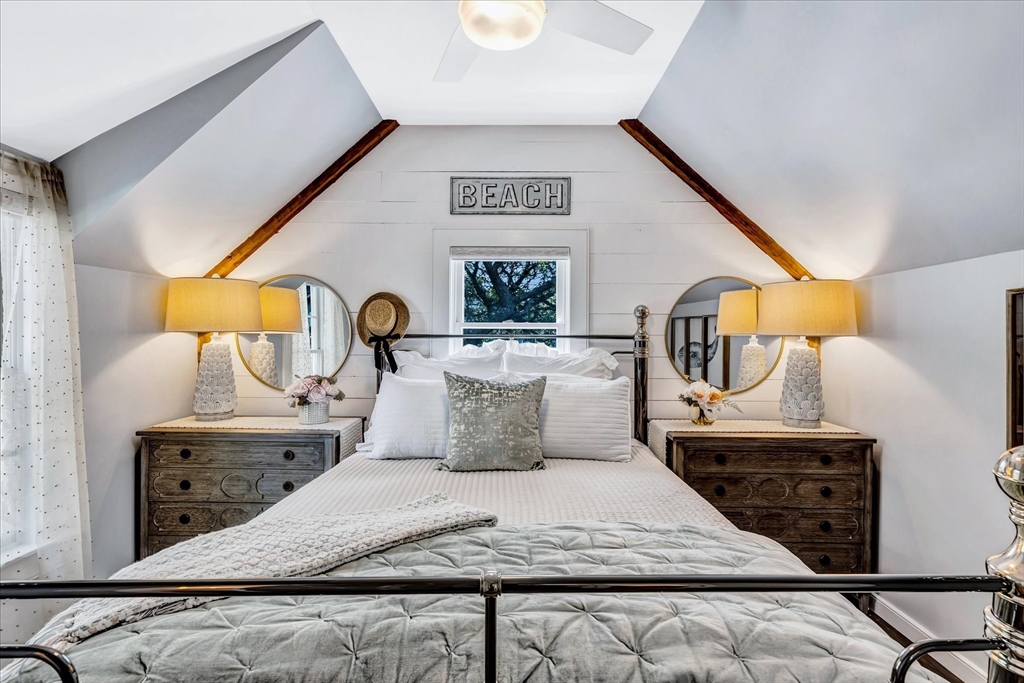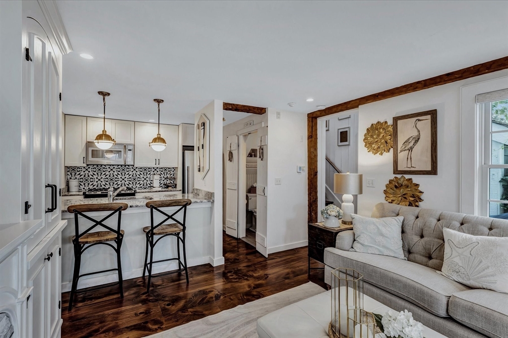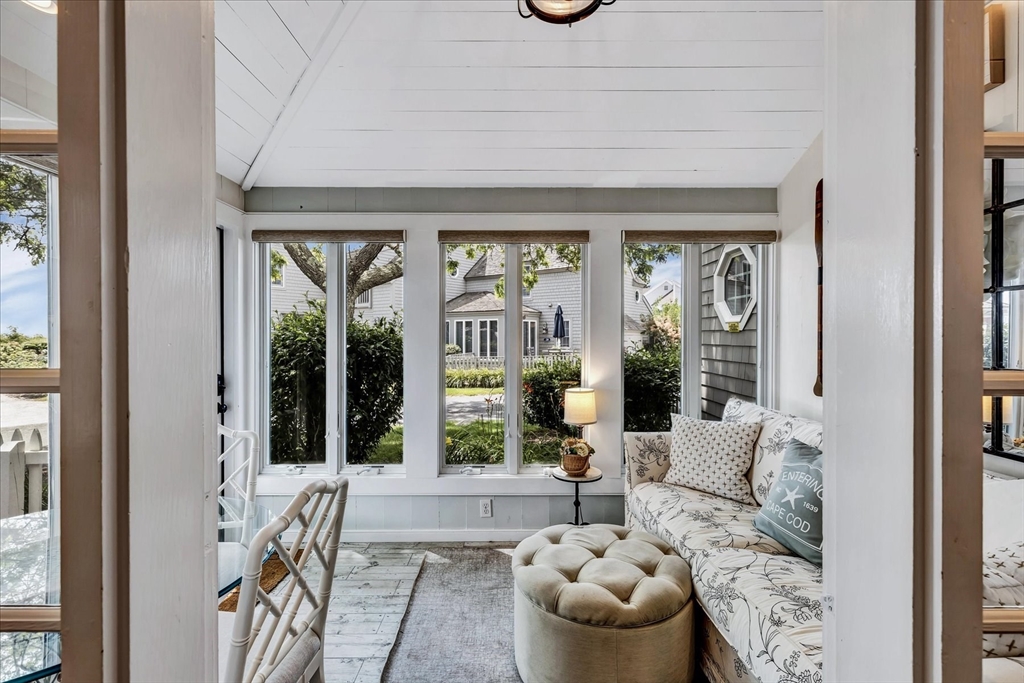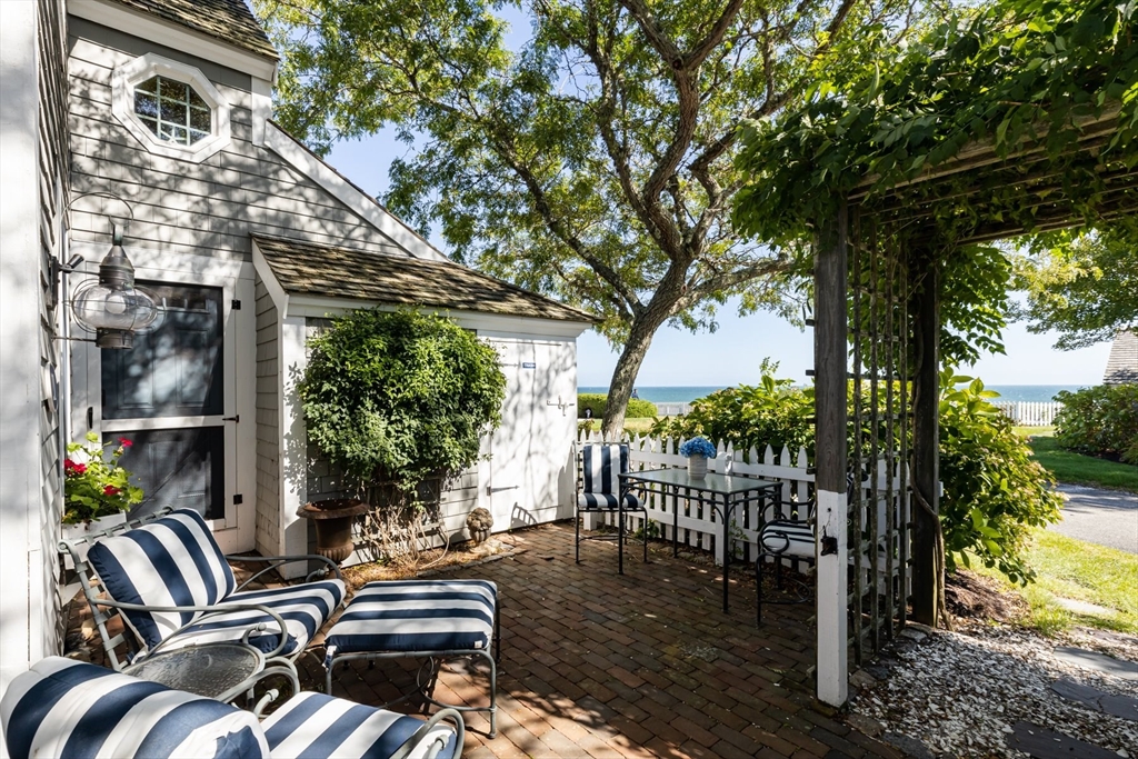 Fabulous ocean-view condo at Maushop Village in the resort community of New Seabury. The condo was also featured in the Cape Cod Home Magazine Summer of 2022 edition. The 1st floor features a living room w/custom built-ins, sunroom dining area w/endless views of Nantucket Sound, full kitchen, ½ bath, bedroom w/vaulted ceiling & skylight, under stair storage, washer/dryer, custom blinds. The 2nd level features the primary bedroom with vaulted ceilings, spa inspired full bath with clawfoot tub and full glass enclosed shower. Outdoors you have a private patio where you can listen to the soothing sound of waves hitting your private deeded beach with captivating views Martha's Vineyard. Listing disclosure: the furniture pictured in the photos are from the previous listing and are for staging ideas only.