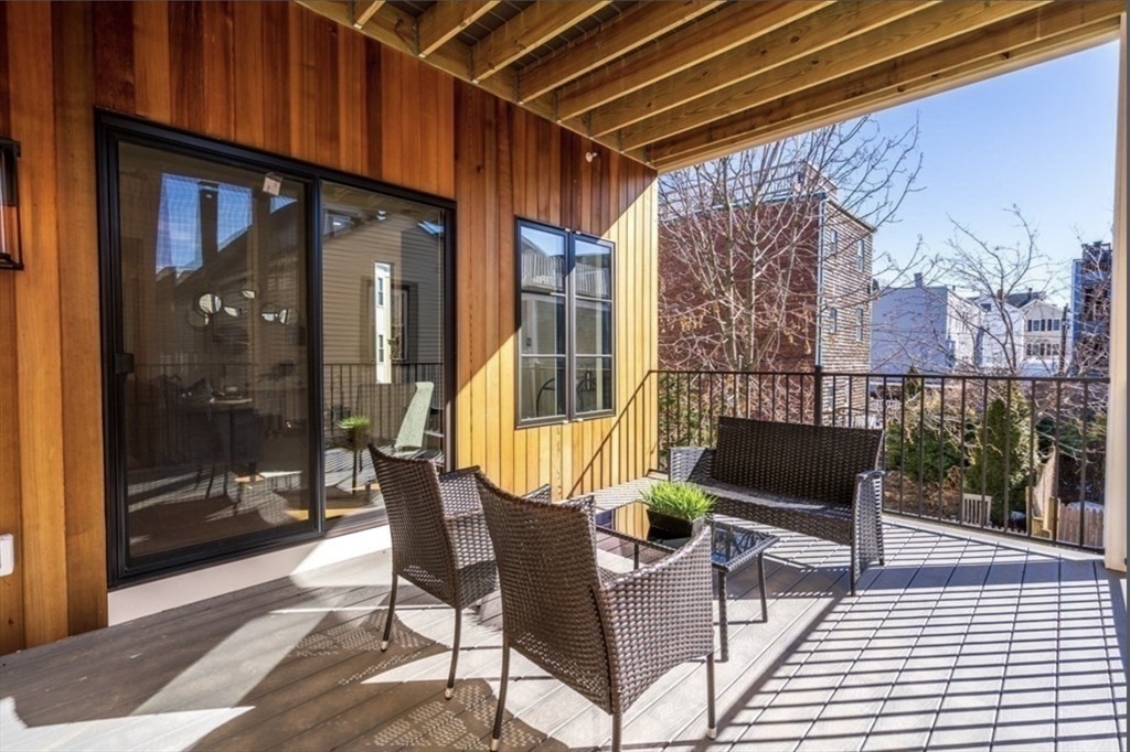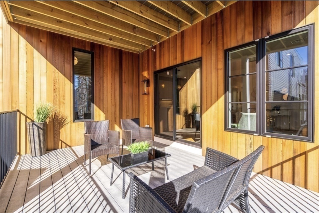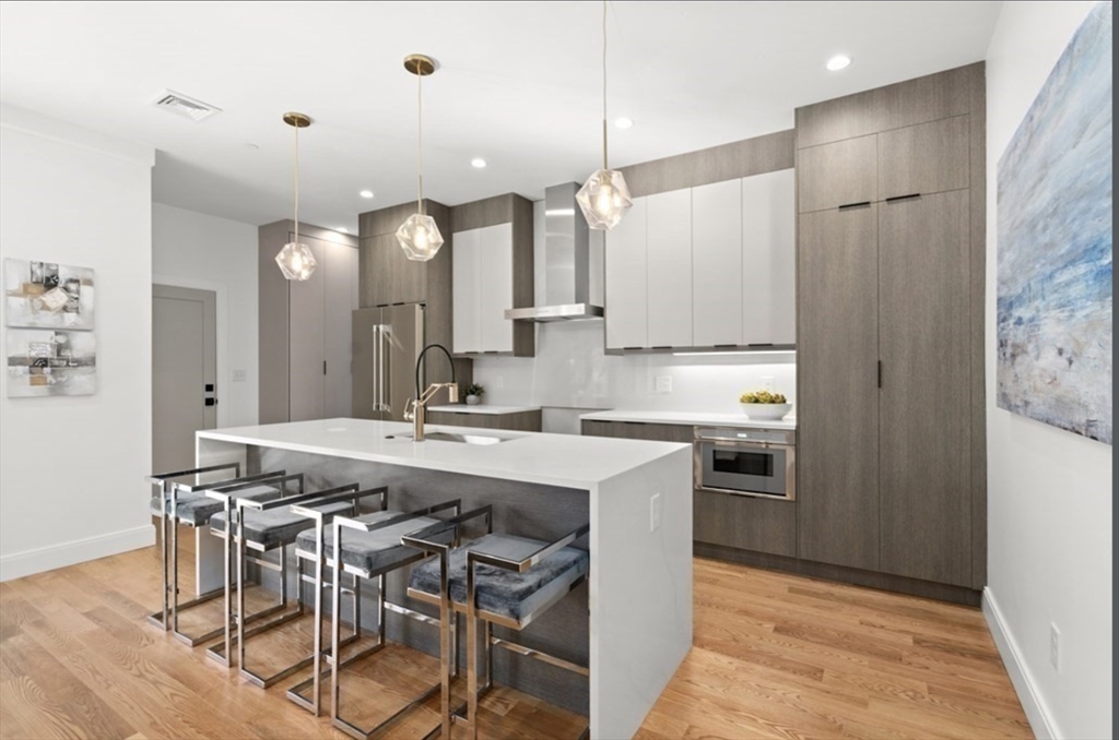 Stunning 2021-built South Boston penthouse with elevated design, premium finishes, & exceptional private outdoor living. This 2-bed, 2-bath home features an open yet defined layout w/dining area, expansive living space w/ fireplace. Interior access leads to an oversized roof deck with sweeping city views, perfect for entertaining. Chef’s kitchen by DelAnno Boston offers dual-tone cabinetry, waterfall quartz countertops, stainless appliances, custom lighting, & built-in mini bar with refrigerator plus two wine refrigerators. Bedrooms fit king beds; primary suite has two closets and spa-inspired bath with bold tile and radiant floors. Wide-plank oak floors, mudroom, central A/C, Rinnai tankless water heater, basement storage, & 2 deeded covered parking spaces. Prime West Side location near shops, dining, and West Broadway conveniences.