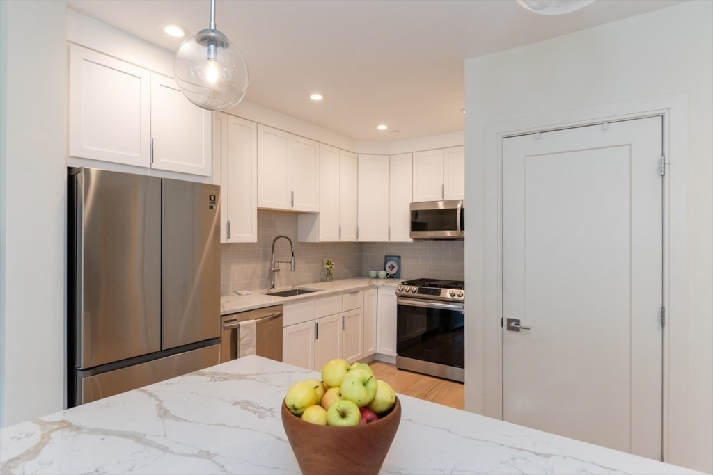 Experience elevated urban living in this coveted East Boston penthouse condo, built in 2021 and offering 1,049 SF of stylish, modern space with 2 bedrooms, 2 baths, and a deeded covered parking spot. The open-concept kitchen, living, and dining area is flooded with natural light from a large picture window and opens directly to a private balcony—perfect for morning coffee with skyline glimpses! The sleek alcove kitchen features a four-seat island, quartz countertops, stainless steel appliances, gas cooking, and crisp white shaker cabinetry. A spacious living area balances comfort and functionality accommodating larger furniture and dining. The primary suite shines with double built-in closets, double vanities, and a custom tiled shower. Second bedroom offers flexibility as guest/ office with closet and large window. In-unit laundry, Nest thermostat, hardwood floors and entry hall. Savor Eastie with a 15 min. commute downtown, blocks to ferry, parks, restaurants and Tallship!