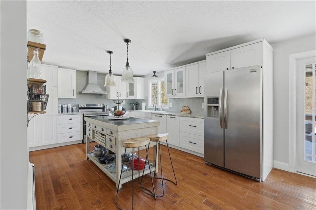 Nestled at 14 Windchime Drive in Mansfield, this lofted-split style home offers a rare opportunity for waterfront living. Set directly on a tranquil pond, the property includes a private dock—ideal for fishing, swimming, kayaking, or simply enjoying the views. Inside, the living room features a striking fireplace, soaring beamed and vaulted ceilings, and skylights that flood the space with natural light. The open-concept layout flows into a well-appointed kitchen with stone countertops, classic shaker cabinetry, a wall chimney range hood, and a center island with breakfast bar. The adjoining dining area and french doors lead to an elevated deck overlooking the pond & backyard, creating a seamless indoor-outdoor connection. Three bedrooms & a full bath are located on this level. Upstairs offers an oversized primary suite and a spacious family room, both with access to an additional deck and pond views. A unique blend of comfort, space, and setting in a desirable Mansfield neighborhood.