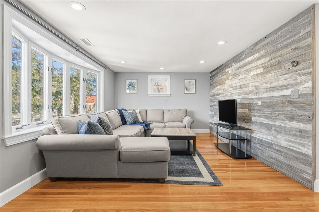 Open & bright, fully renovated condo w/ parking is walkable to Watertown Sq! Lovely 2nd floor home w/ private entrance is highlighted by gleaming hardwood floors, spacious rooms & recessed lighting. It welcomes you into the living room adorned with a bay window and reclaimed barn board accent wall. Corner nook could be used as mudroom or office area. Sprawling dining room and '19 renovated kitchen features peninsula w/ range & vent hood, stainless appliances, granite counters and warm, maple cabinetry. An arched doorway leads to two sizeable bedrooms and the stylish, modern bath with a floating vanity, wall-mounted linen storage & shower w/ sliding glass doors. Enjoy two car driveway parking (+ easy street parking for guests!), private rear deck, shared back yard & prvt basement laundry + storage. Pet friendly. Desirable neighborhood mins to restaurants, cafes, Watertown Sq, bus to downtown, & Saltonstall Park, featuring concerts & Farmers' Market. Showings begin: Sat & Sun OH.