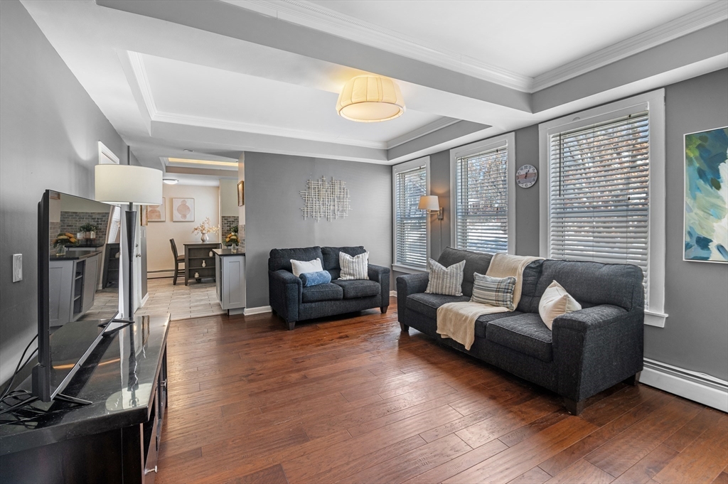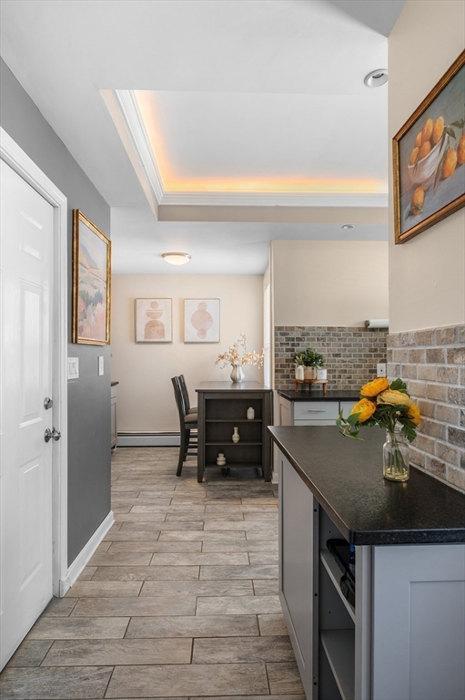 Sun-filled and move-in ready 2-Bedroom, 1-Bath first-floor condo in desirable Bradford. Bright, airy living spaces feature custom tray ceilings with integrated LED cove lighting, detailed moldings, recessed lighting, and newer updates including heating system, kitchen, bath, and appliances. Ideal layout for easy living with natural light throughout. Enjoy the commuter rail and close proximity to downtown shops, restaurants, parks, and lakes. The brand-new Hunking Middle School is an added bonus. Prime location, strong updates, and turnkey condition—showings begin Friday 4:30-6. This one will not last. See offer instructions in MLS.