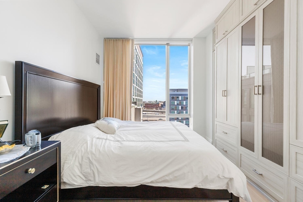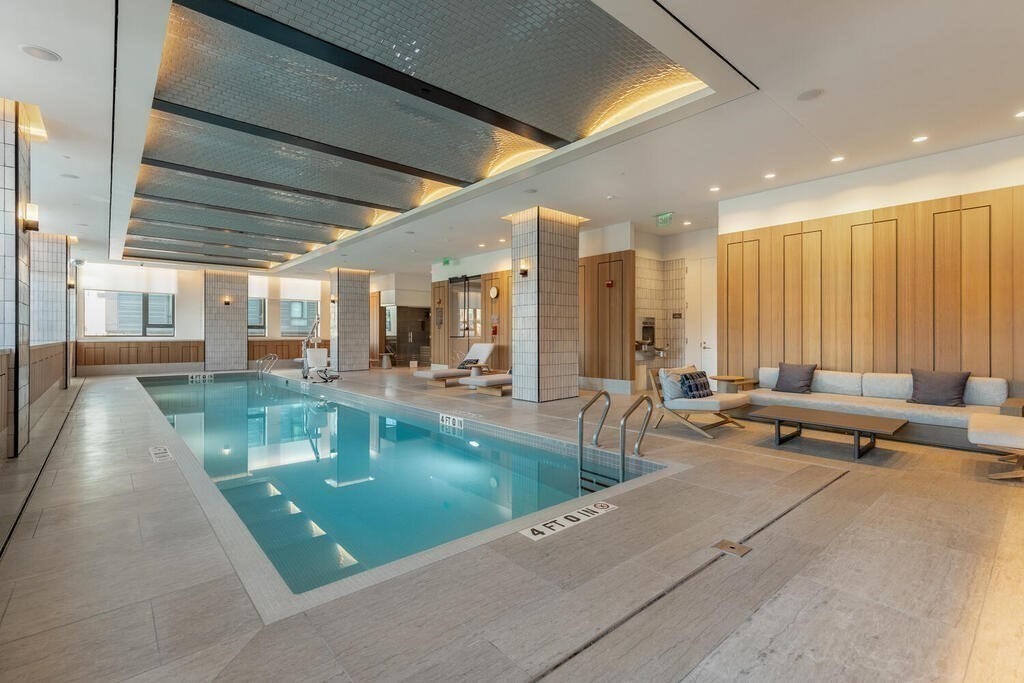 THE QUINN | This refined one-bedroom, one-bath residence features an open-concept kitchen and living area ideal for entertaining, with European white oak floors, a paneled Thermador and Bosch appliance package, and custom Italian cabinetry. The home includes premium developer-upgraded bathroom finishes with a custom Italian vanity and white marble, along with owner upgrades such as premium closet systems in the entry, laundry, and walk-in bedroom closets, and custom wall-to-wall built-ins in the bedroom. The Quinn offers an elevated lifestyle with world-class amenities, including an indoor lap pool, sauna, 8,000-square-foot fitness center, squash court, billiards room, game room, and work lounge, all conveniently located near Whole Foods, the South End’s restaurant row, and with easy access to I-93 and I-90.