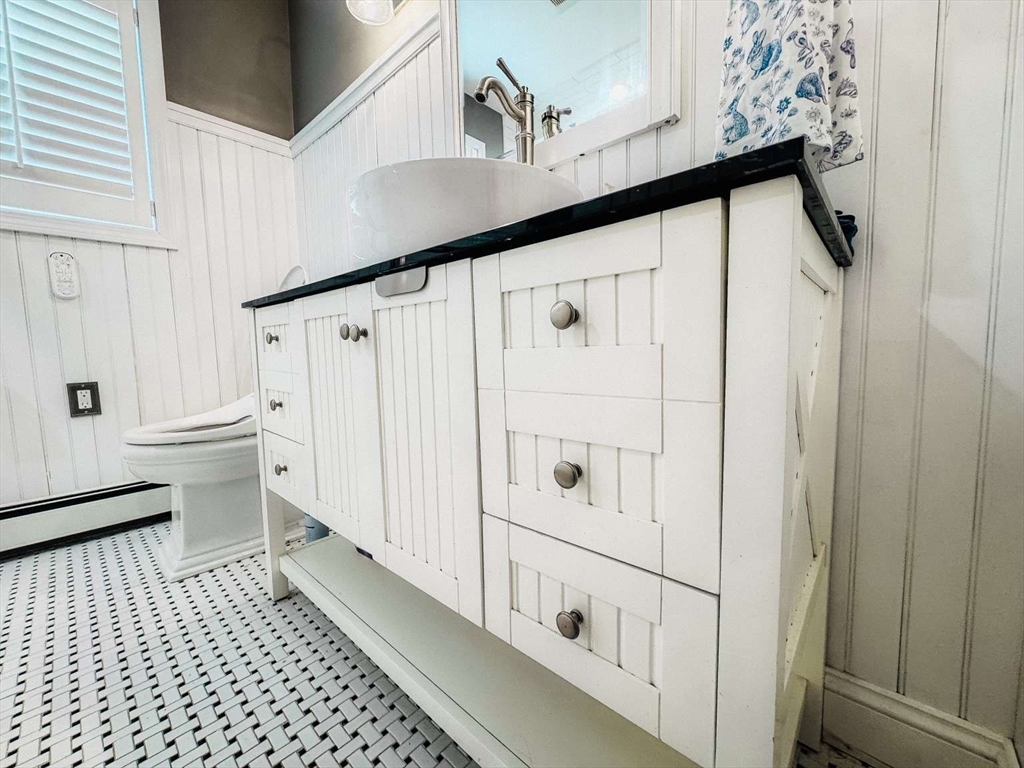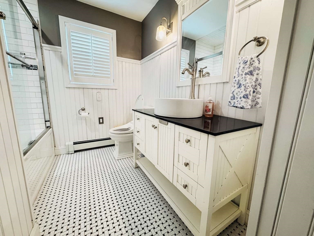 Beautifully maintained raised ranch offering 3 bedrooms and 2 baths with central air throughout. The upper level features a thoughtfully updated kitchen with quartz countertops, hardwood flooring, double oven, pot filler, and a large custom-designed island with integrated microwave, maximizing functionality and counter space. The kitchen opens to a spacious living area with gas fireplace. French-style hinged doors lead directly to a newly constructed high-end deck overlooking the backyard, creating an ideal indoor/outdoor living space. Hardwood floors are in excellent condition throughout. The finished lower level includes a full bath and existing plumbing and electrical for a future kitchen, offering excellent flexibility for extended living or in-law potential. The lower level also has a potential 4th bedroom which is currently used as a holiday storage room with shelves (see photos). Off-street parking and meticulous upkeep throughout reflect true pride of ownership.