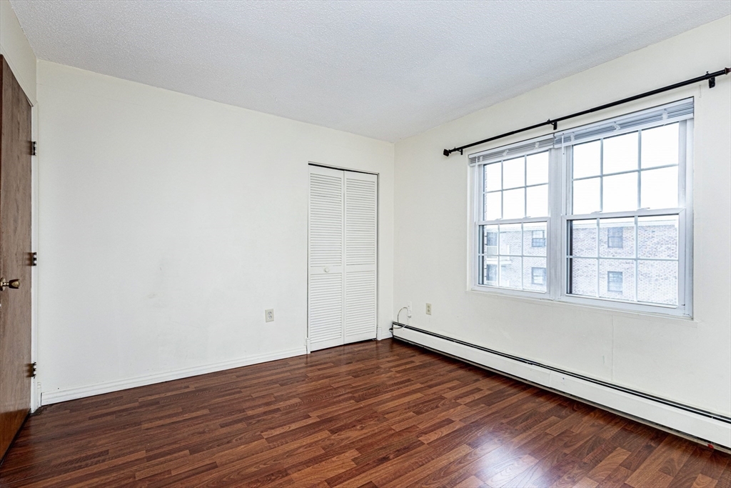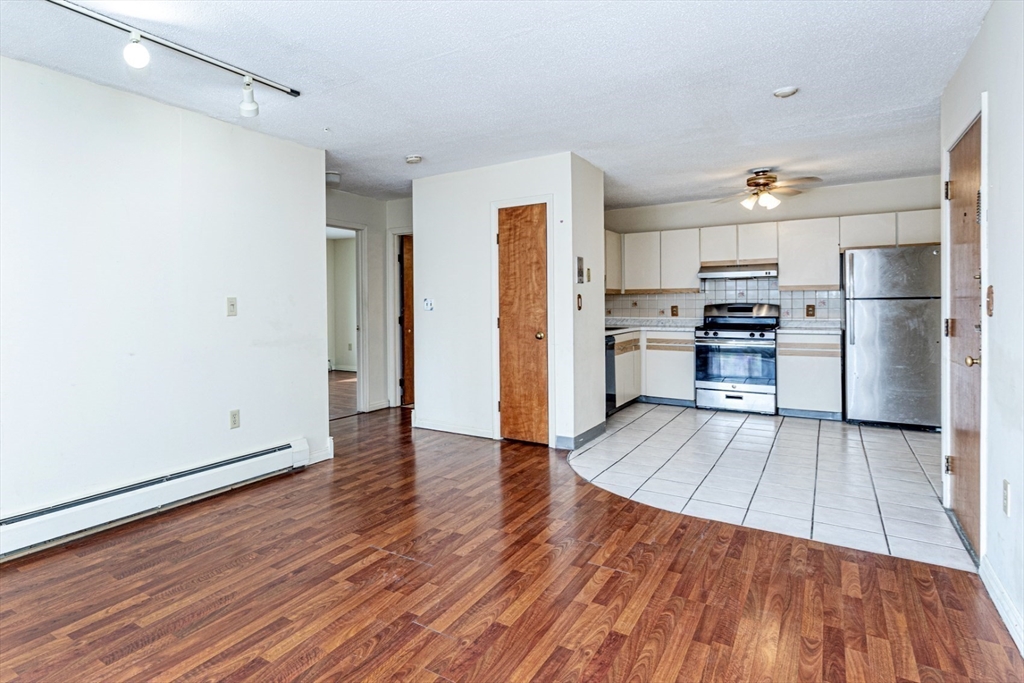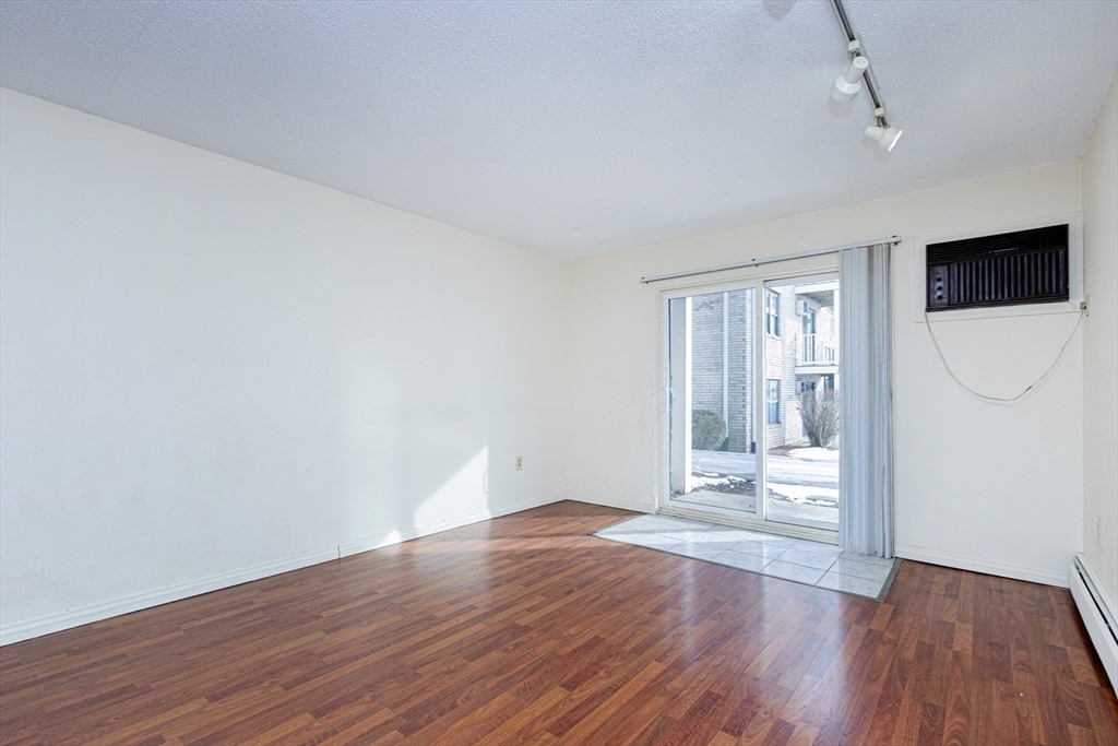 Bright and sunny spacious unit at the sought after Plaza Place. Gleaming hardwood floors throughout with tile in kitchen and bath. Two generously sized bedrooms with plenty of closet space. The open concept kitchen and living room make this unit unique. Sliders to the patio provide exterior access from the unit and allow an abundance of natural light! Rental fee includes heat and hot water and Gas! Extra secured storage in attic. Laundry facilities are in the building. Walking distance to shopping, restaurants and schools. Very convenient location - commuter friendly with quick access to RT 3, RT 3A, I-95. Public transportation nearby.