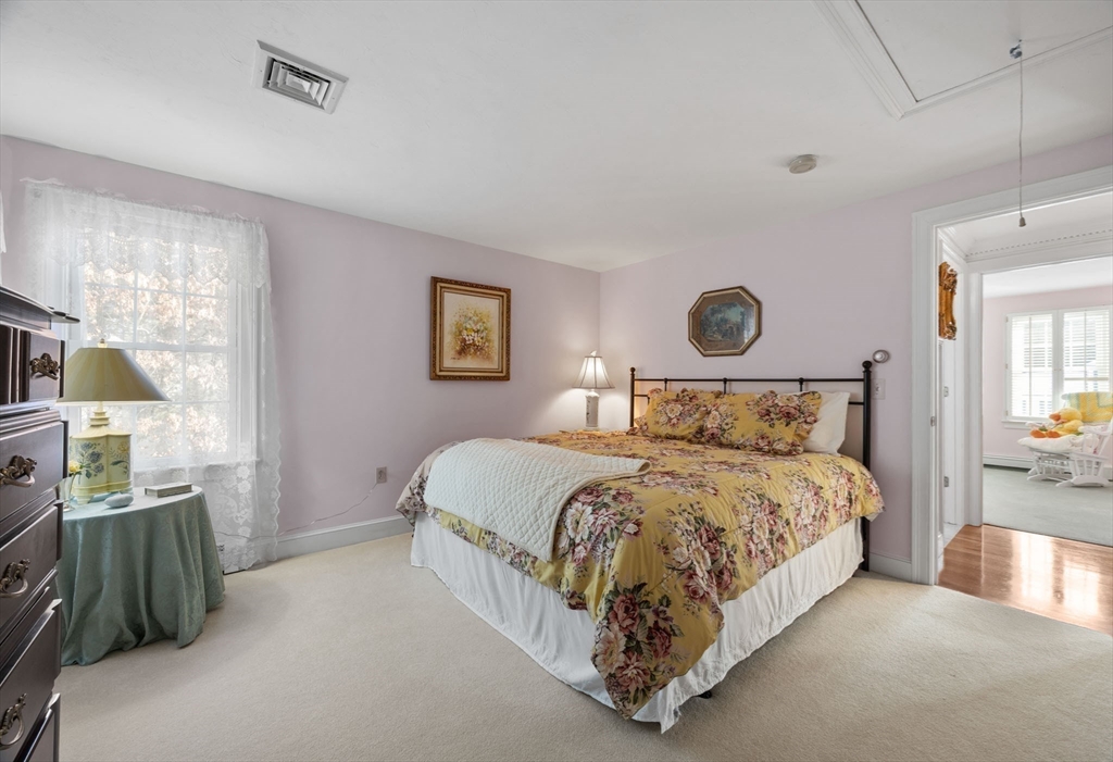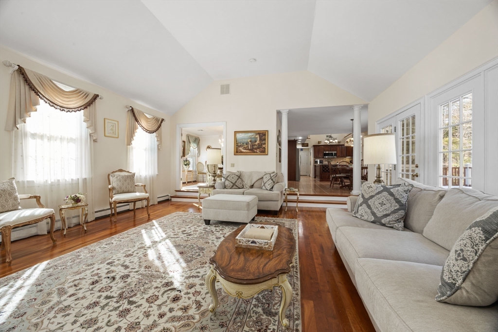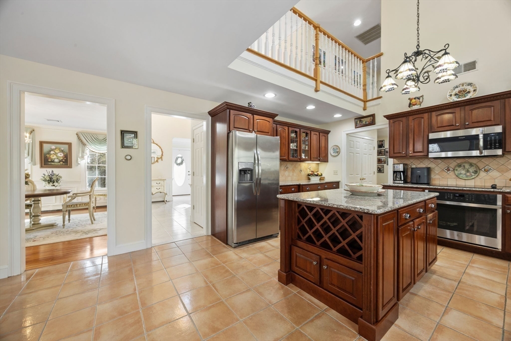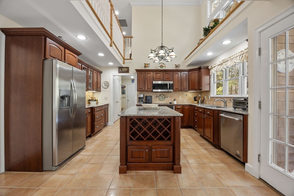 Situated on an corner lot in the desirable Indian Pond Estates neighborhood, this 4-BR home presents an attractive property maintained in great condition. The living room provides a distinguished setting, featuring a gas fireplace & wall of glass overlooking the expansive deck and serene wooded lot. Built-in shelves, custom trim, crown moldings, high ceilings, and the vaulted ceiling LR , kitchen and foyer collectively create an atmosphere of refined spaciousness. Culinary aspirations are easily met within the thoughtfully designed, open-concept kitchen, which includes a substantial island & ample seating space. A formal dining room is at the center of the 1st floor, and a wood-paneled Library with its own fireplace offers additional flexibility. An oversized primary suite with 2 walk-in closets plus three additional generously-sized bedrooms. 1st floor laundry room, mudroom & separate half bath. Cherry wood flooring throughout. Full, walk-out basement ideal for future expansion. Wow!