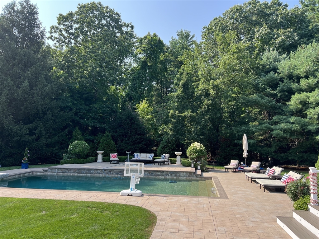 Custom-built expansive 5 bedroom Cape offering nearly 5,000 square feet of refined yet comfortable living.The first floor spans over 3,300 square feet and is designed around walls of glass that flood the home with natural light and provide seamless access to a private, resort-like outdoor setting featuring a state-of-the-art gunite pool.Generous interior spaces are ideal for both everyday living and entertaining. The chef’s kitchen showcases white cabinetry, a large center island, and opens to additional dining and gathering areas. A welcoming family room features a gas fireplace flanked by floor-to-ceiling built-in bookcases, while French doors lead to a formal dining room.The first-floor primary wing delivers a five-star experience with elegant primary; newly renovated spa-inspired bath, dual walk-in closets, and a private office. The second level offers two spacious bedrooms and a separate family/playroom, providing flexible living space. Located near beaches, schools & commuting.
