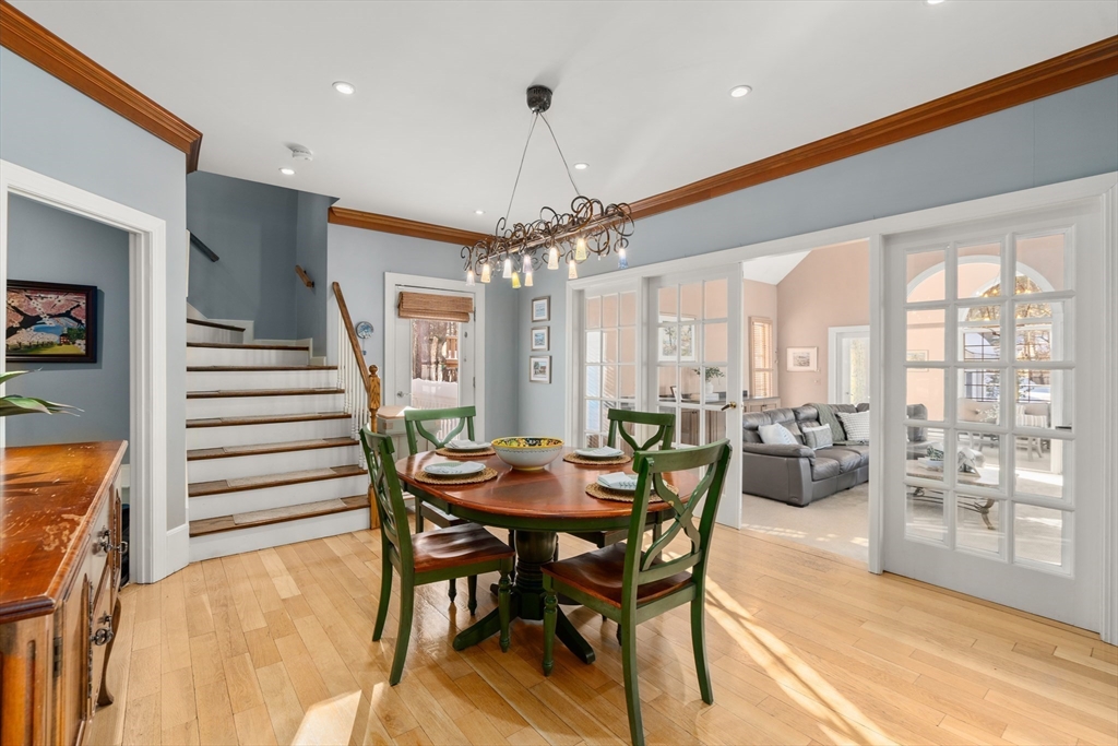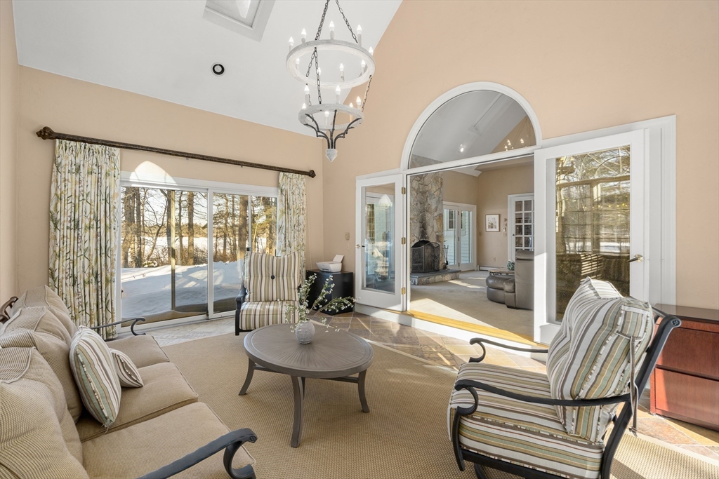 Waterfront living in a premier Sudbury cul-de-sac with spectacular sunset views. This expansive Colonial offers private dock access and beautifully landscaped grounds. Sun-filled living and dining rooms feature dentil molding and sweeping lake views. The dramatic great room includes a cathedral ceiling, stone fireplace, and lake view windows leading to a 4-season sunroom. The gourmet kitchen features custom cabinetry, oversized island, Wolf double-oven, Sub-Zero fridge, and Miele dishwasher. First floor also includes a parlor and study with custom cherry built-ins and fireplace. A curved front staircase plus back staircase lead upstairs to 5 bedrooms and 3 full bathrooms including a guest suite with ensuite bath. The primary suite offers dual walk-in closets and stunning sunset views from the bedroom and bath. A finished lower level with wet bar and full bath offers flexible space. 3-car garage, walk-up attic, hot tub, and minutes to the new community center complete this special home.