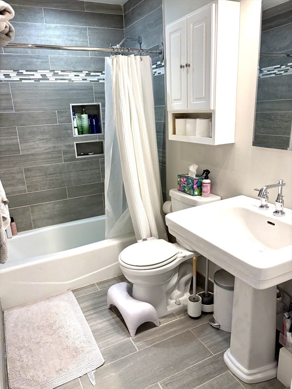 Available starting March 1: Charming and spacious top floor condo unit. Open concept kitchen with stainless steel appliances and granite countertops leading to a large living/dining space with beamed ceiling and skylight. Two large bedrooms, an updated bathroom, a study and laundry in the unit. Reserved parking space, walk to the (B), (C) and (D) Green Line.